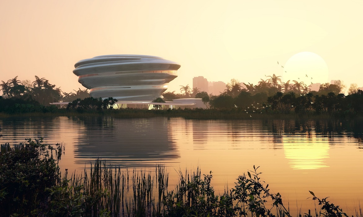 Futuristic Science and Technology Museum Resembles a Floating Cloud Over the Water