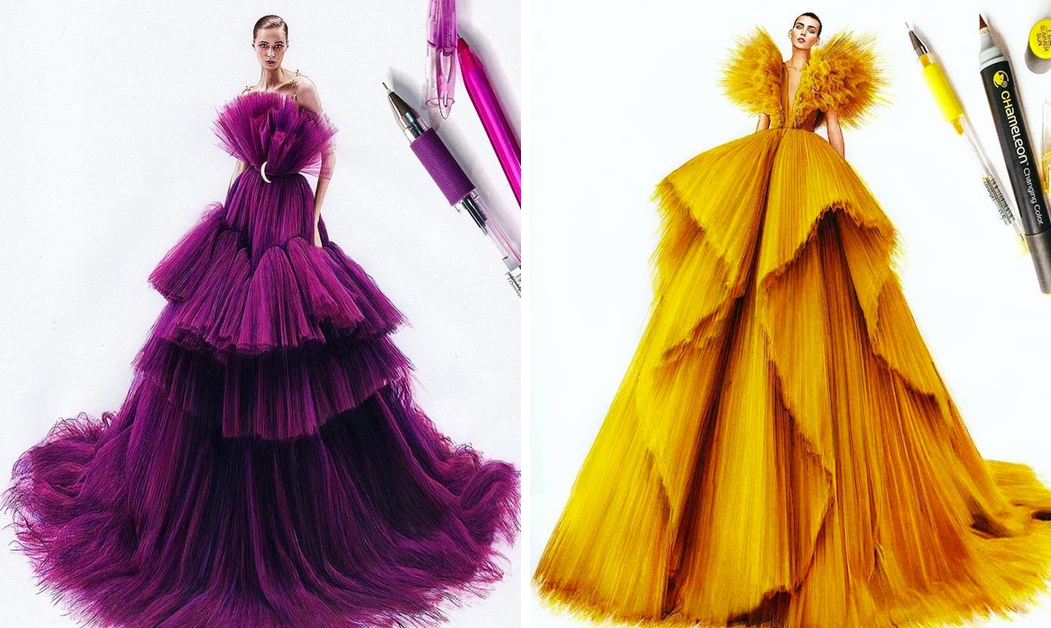 Before a stunning outfit makes it to the runway, it's usually drawn on paper. This process makes conceptual ideas easier to understand, but it's also a beautiful art in itself. Mexican artist Eduardo Torres creates realistic fashion illustrations based on some of the most fantastical clothing designs he finds on Instagram. These stunning drawings feature futuristic suits that resemble metal armor, bejeweled frocks, and numerous floor-length gowns.