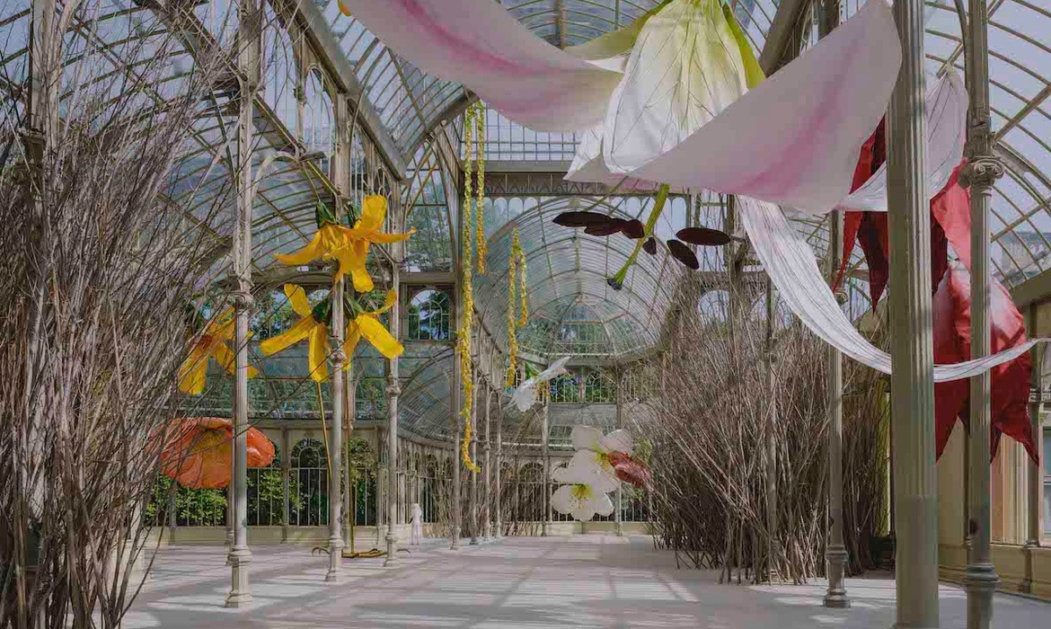 Kosovar artist Petrit Halilaj has created a fantastical, yet deeply personal, installation for his first solo exhibition at the Reina Sofía's Palacio de Cristal in Madrid. Inspired by the elaborate courtship rituals of bowerbirds, who are known for decorating structures to attract a mate, he's strung up enormous flowers inside the glass conservatory. Halilaj's work often tackles themes of home, nation, love, and cultural identity.