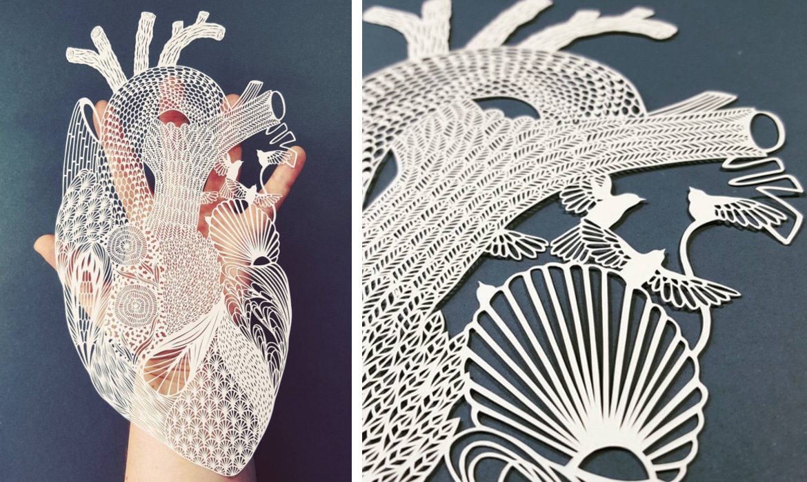 Artist Pippa Dyrlaga is truly a master of paper cutting. The gifted crafter produces intricately detailed creations with visually stimulating patterns. Much like her older paper art, each of Dyrlaga's recent works are crafted from a single sheet of paper, showcasing the artist's steady hand and unwavering skill. Spanning stylized flora, fauna, and even anatomy (a central theme of her new Biophilia-themed series), the Yorkshire-based artist's collection of cut-outs appears to exhibit an eclectic interest in subject matter.