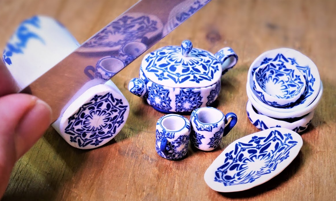 No, your eyes are not deceiving you. You're looking at miniature dinnerware made of polymer clay, handcrafted by a South Korean artisan known as Clay Zoo. By using white and blue clay that is folded on itself to create realistic ceramic patterns, the artist constructs a tiny tea set with a teapot and mugs, as well as a variety of bowls and serving platters. Each piece is skillfully handmade from a meticulously designed clay cane.