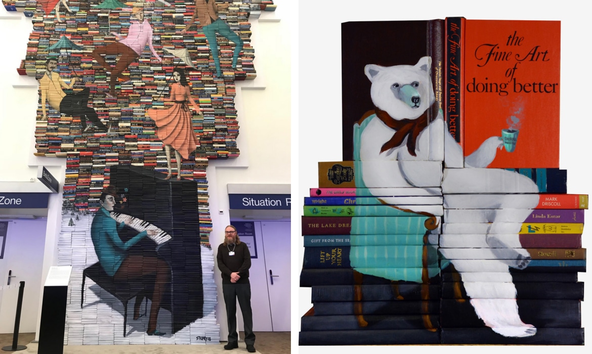 For years, we've been following Mike Stilkey‘s ever-growing collection of book art. Using disposed and discarded reading material, the Los Angeles-based artist crafts striking sculptures that breathe new life into overlooked stacks of old books. Stilkey's one-of-a-kind creations range in scale, materializing as both table-top arrangements and monumental installations.