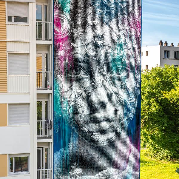 Paris-based street artist Alexandre Monteiro, known by his pseudonym Hopare, is instantly recognizable for his ability to combine the abstract and figurative. Delicate linework outlines the features of his usually female figures, while geometric lines slice and dice the face into smaller shapes.