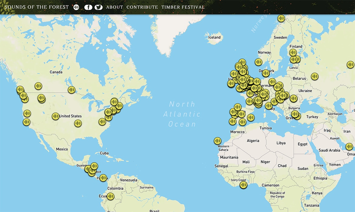 The free audio archive Sounds of the Forest is an interactive sound map celebrating the noises of forests around the world. This open source library of nature recordings is run by Timber Festival—a UK-based annual celebration of forests and trees. When the physical festival had to be canceled due to COVID-19, Timber Festival decided to use the power of sound to bring nature-lovers together.