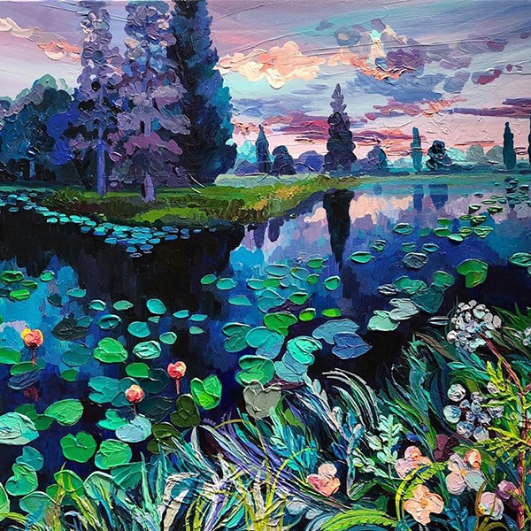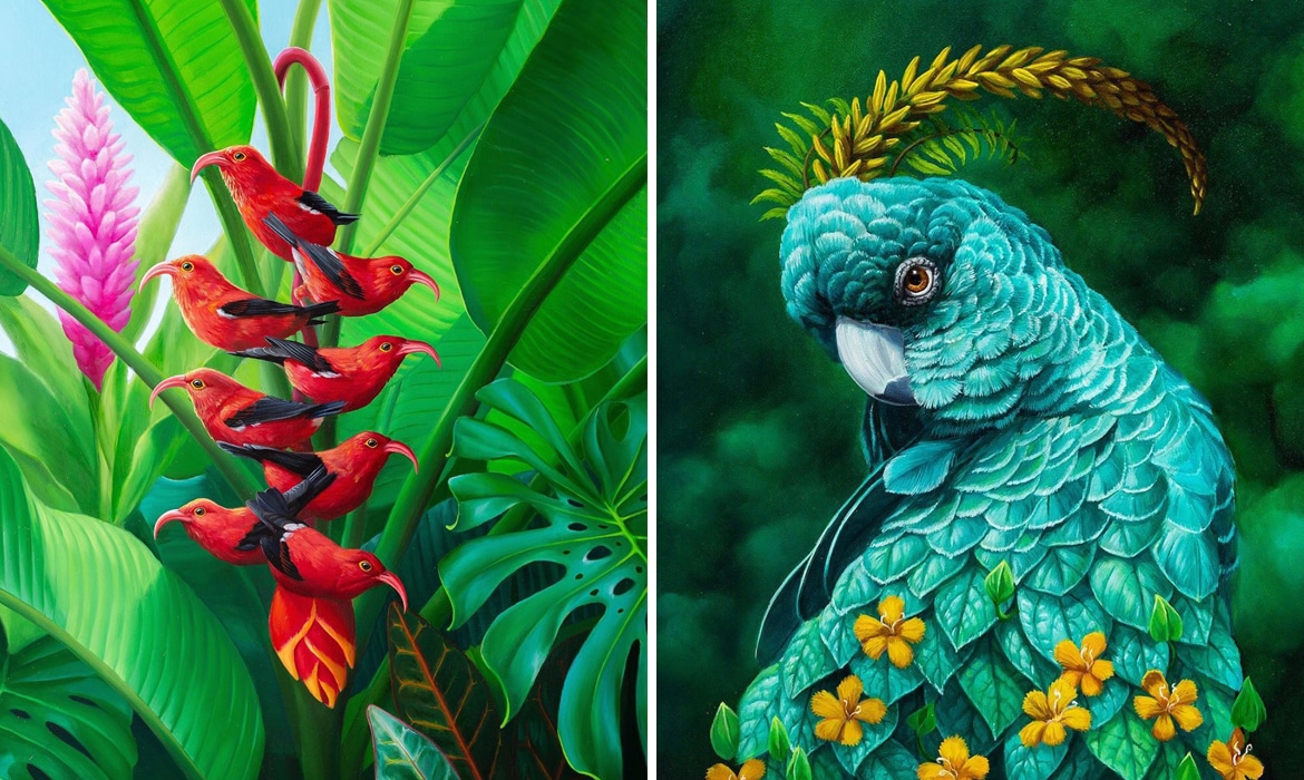 Artist Jon Ching is mesmerized by the beautiful plumage of birds. He celebrates their incredible markings and colors in dreamlike paintings that fuse animals with other parts of nature—and sometimes other creatures, too. In one instance, small red birds replace the bulbous blooms on tropical plants. Another of Ching's oil artworks presents a stately portrait of a turquoise-colored bird whose layers of feathers morph into leaves punctuated by yellow flowers.