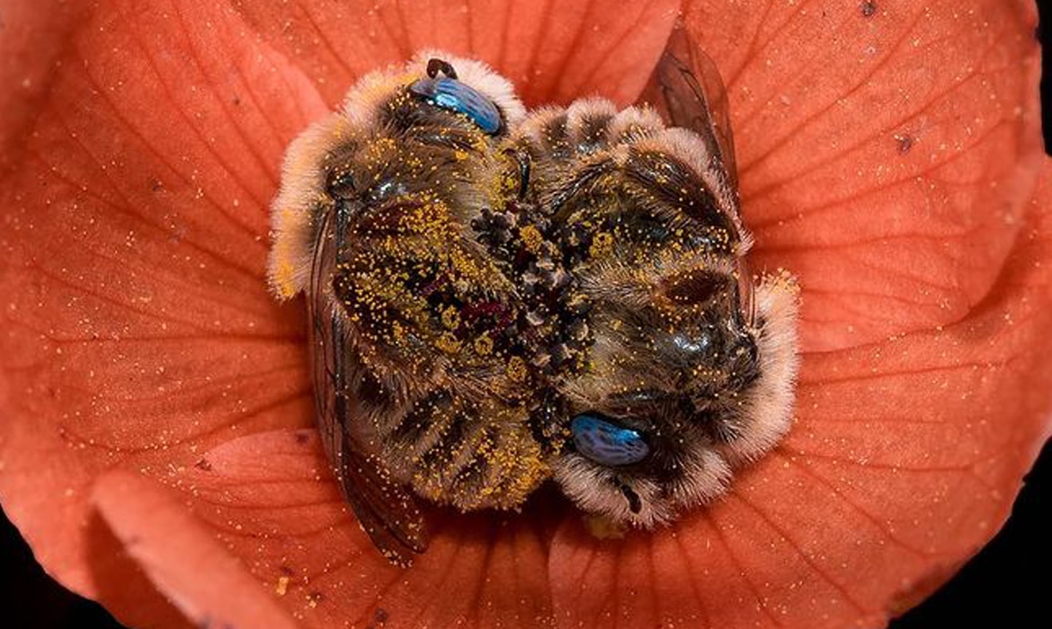Photographer Discovers a Pair of Sleepy Bees Snoozing in the Middle of a Flower