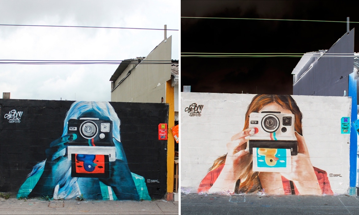 Colombian artist Sepc is known for his figurative aerosol art and graffiti lettering, but it's a new technique that is making waves. The artist was looking for a way to reinvent himself when he decided to experiment with painting in “negative.” The results are pieces of art that can only be fully appreciated when “developed” into a “positive” image.