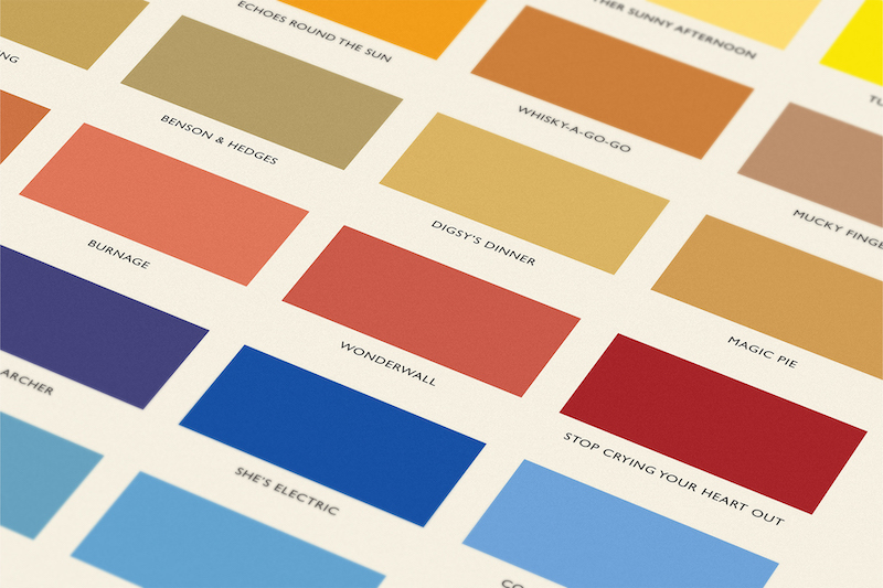 There are more humorous allusions peppered throughout the Colors of Oasis poster as well. Accompanied by a leathery orange, “Whisky a Go Go” acknowledges the venue of the band’s infamous 1994 L.A. show, which ended in disaster thanks to an incorrect set list and crystal meth. “Shite-Life,” on the other hand, is a nod to Liam’s insult to Blur during the 1996 Brit Awards show, following years of intense rivalry between the two Britpop bands.