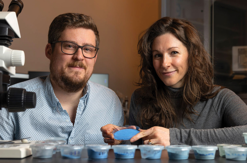 Travis Olds (l.) and Lisa Haney with powders the WSU team created for their research into Egyptian blue. (Photo: Joshua Franzos, Carnegie Museum of Natural History)