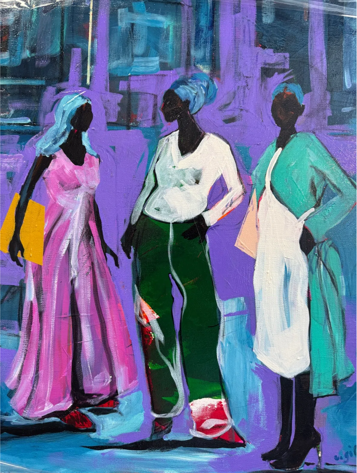 Imbued with radiant blues and deep purples, each painting in the series meditates upon how love, intimacy, and joy manifest within a wide variety of familiar contexts. Throughout, we encounter a couple tenderly embracing each other outside of a clothing shop; a woman seemingly deep in thought, resting upon her couch and drinking a cup of tea; a ballerina gliding across the floor of a dance studio; and a group of friends chatting on a city street, coffees in their hands and purses dangling from their shoulders. These scenes aren’t necessarily profound in and of themselves, but they nevertheless reveal how ordinary environments can foster community, memory, and connection.