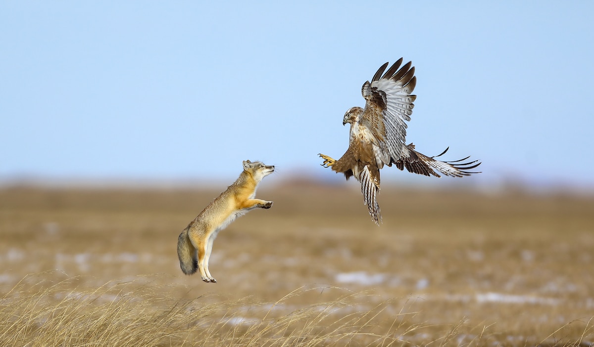 Esta fotografía fue tomada en las praderas de Wongdu Banner, en Mongolia Interior. Tanto el busardo mongol como el zorro corsario (Vulpes corsac) son los principales depredadores de este entorno y comparten una dieta que comprende principalmente pequeños roedores. En consecuencia, son rivales en lo que respecta a la alimentación y a veces se ven obligados a luchar entre sí por la comida. Este tipo de enfrentamiento suele ser un espectáculo y una lucha de voluntades que nunca acaba en un conflicto a vida o muerte. En este caso, el busardo mongol decidió renunciar a su comida y salir volando.