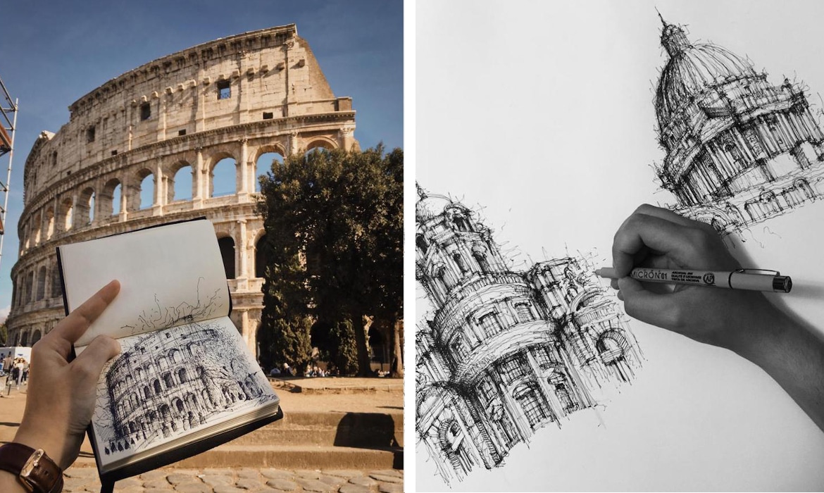 Estos expresivos dibujos capturan los intrincados detalles de la arquitectura italiana