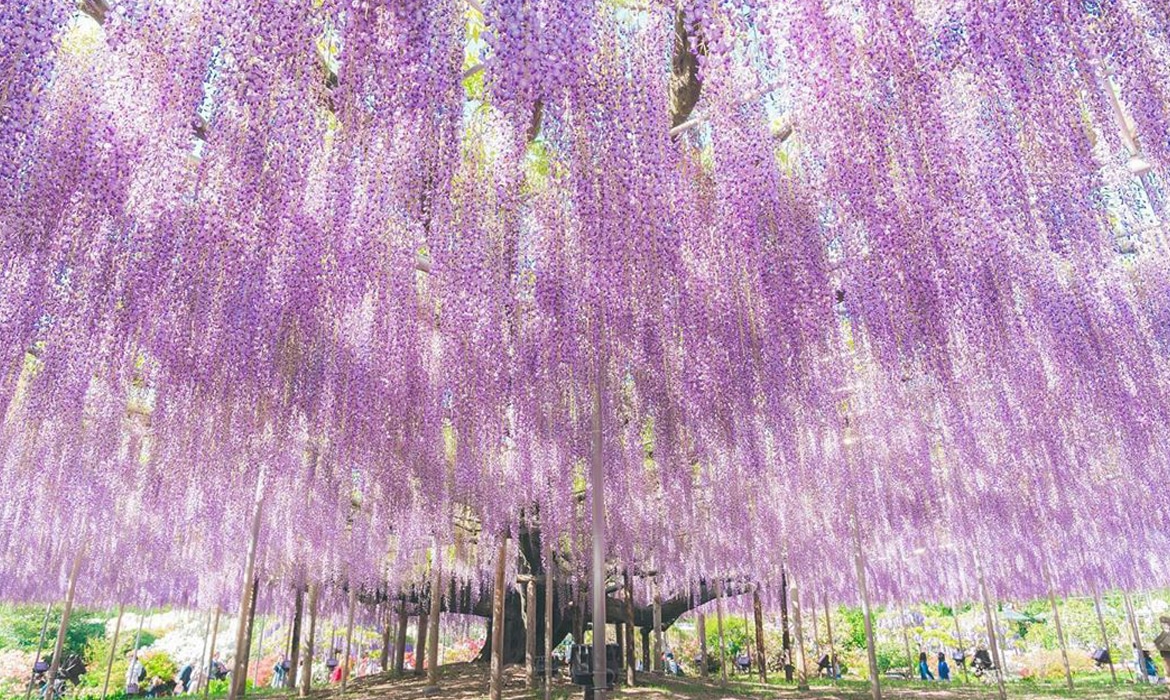 Si visitas el Parque de Flores Ashikaga en Tochigi, Japón, te encontrarás con una glicina que es considerada por muchos como “el árbol más hermoso del mundo”. Con unos 150 años de antigüedad, este enorme árbol es increíblemente bello cuando florece. Las flores verticales cuelgan hasta casi tocar el suelo, y crean una nube rosa y púrpura que flota por encima del césped.