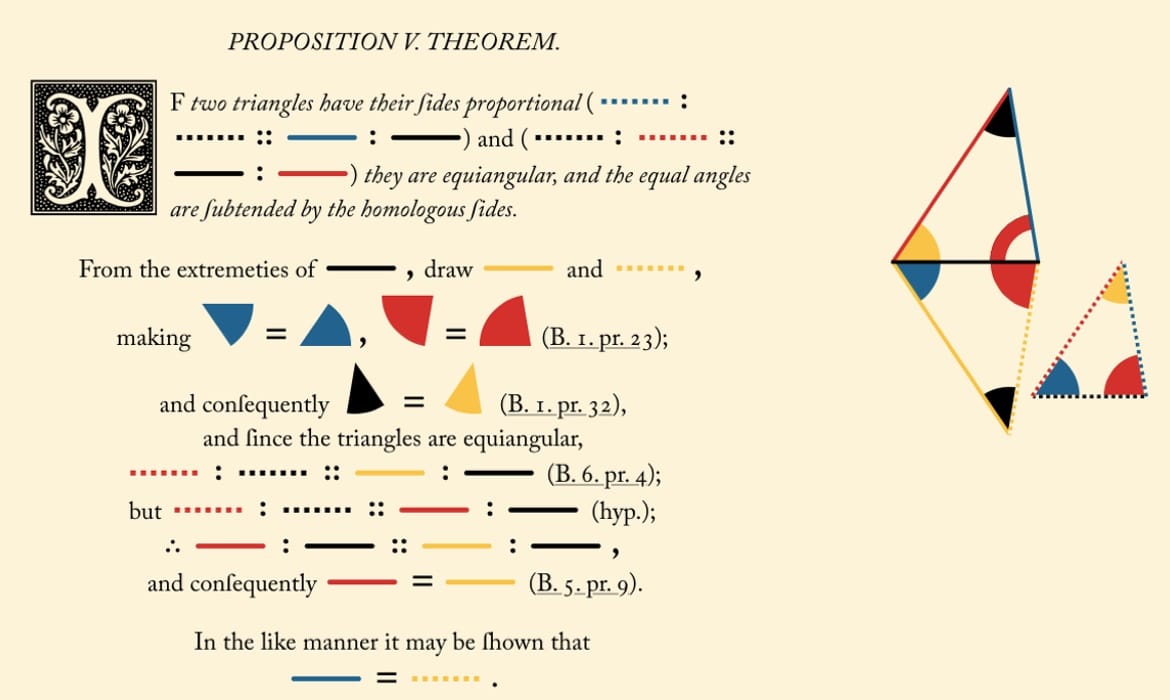 Considerado uno de los libros más bellos del siglo XIX, la representación colorida y visual de los Elementos de Euclides del matemático Oliver Byrne fue publicado en 1847. Al minimizar el texto y enfocarse en los diagramas de colores, Byrne trató de desglosar la geometría de Euclides en lecciones sencillas. El trabajo fue un gran avance en cuanto a cómo las personas pensaban sobre la educación gracias al énfasis innovador de Byrne en el aprendizaje visual.