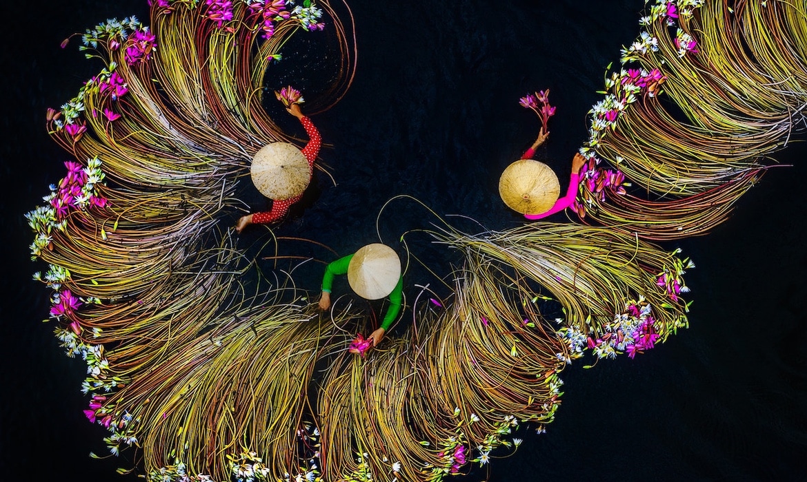 Estas espectaculares fotos documentan de la cosecha de nenúfares en el delta del río Mekong