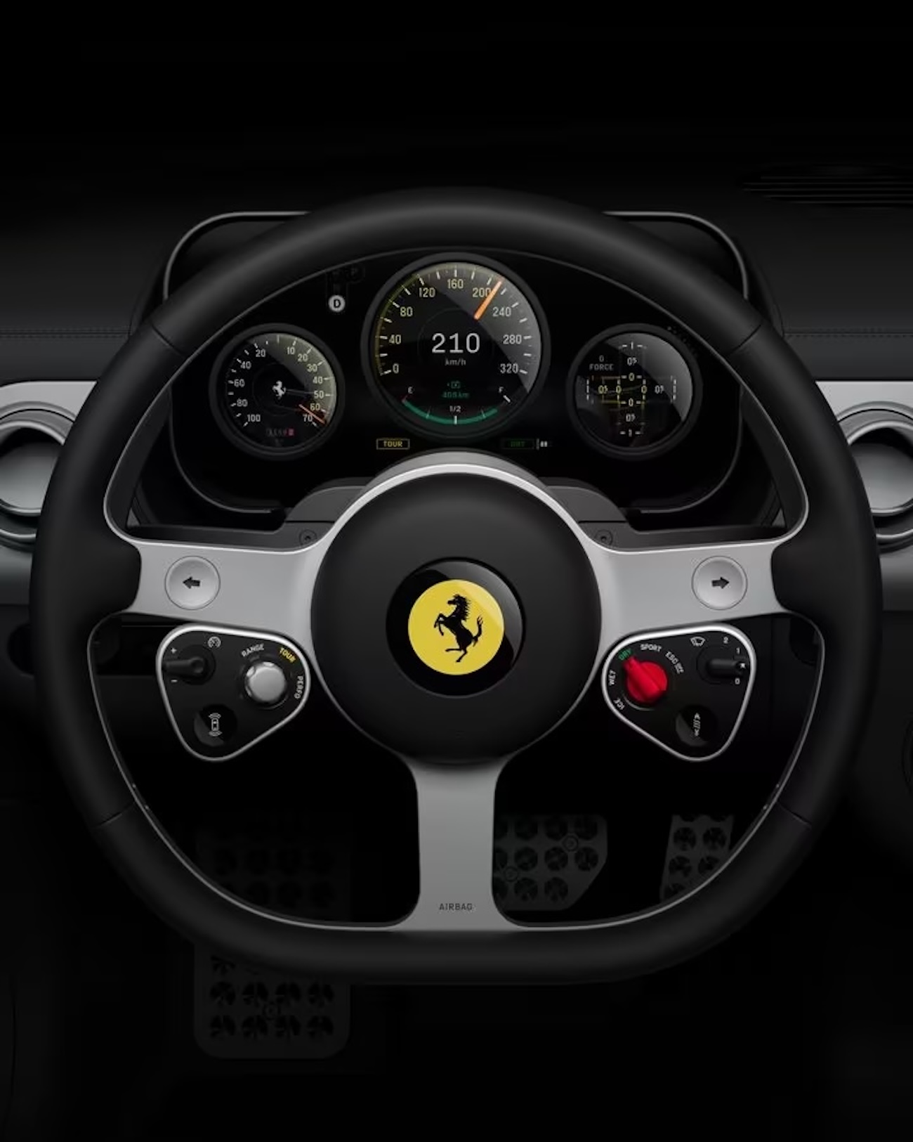 The steering wheel is the perfect example of the collaboration between tradition and innovation. The three-spoke design was inspired by the 1950s and 60s wooden three-spoke Nardi wheel that represents classic, fine Italian craftsmanship. The recycled aluminum is exposed to showcase the material quality, and the whole wheel weighs 400 grams less than the standard Ferrari wheel. Additionally, analog control modules give the driver full, easy control over the car’s mechanics, and brings back the traditional aspect. Its design is extremely intentional, and the emphasis on practicality has the wheel resembling that of a Formula One car. Mounted onto the wheel for an optimized sight line is the binnacle, which contains three OLED panels with a very futuristic display.