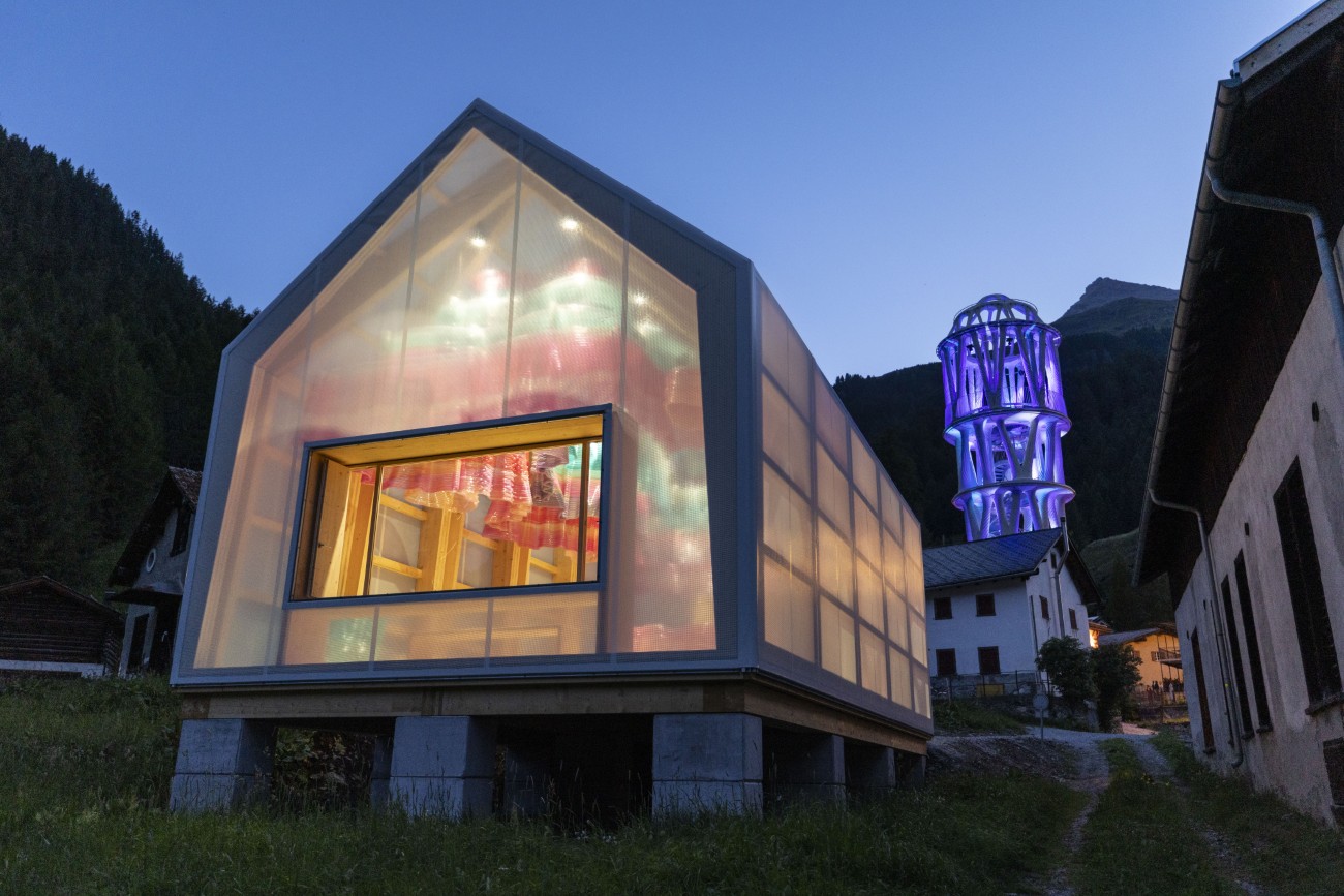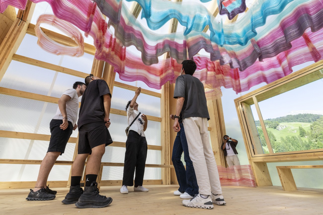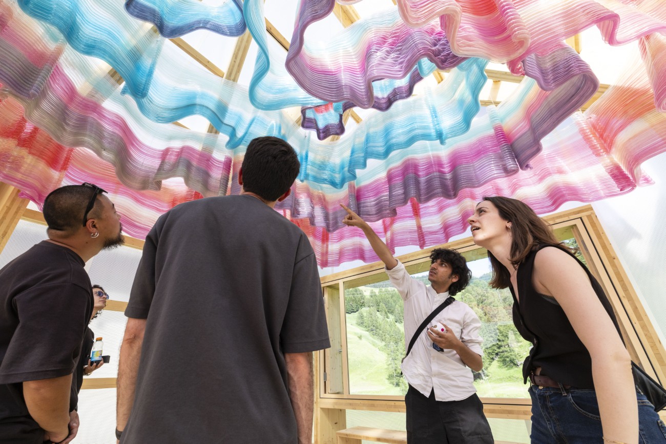 The interior site was designed by ETH students receiving their Master's of Advanced Studies in Architecture and Digital Fabrication. It swirls with color, thanks to 3D-printed “ribbons” made from recycled plastic. Surprisingly lightweight, they hang like banners from the ceiling, creating a striking wave pattern that envelops the space. Origens, a cultural organization operating in the village, and ETH Zurich used recycled PETG to create these sculptural elements. The use of this thermoplastic, which is typically used in food packaging, wonderfully demonstrates the possibilities when using recycled plastic in design.