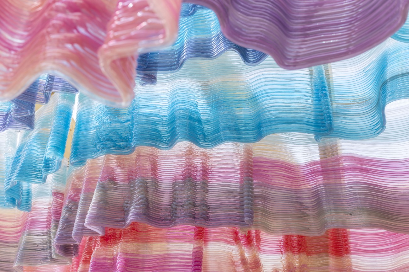 The interior explodes with color thanks to 3D-printed “ribbons” that envelope the space.