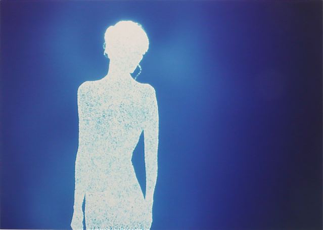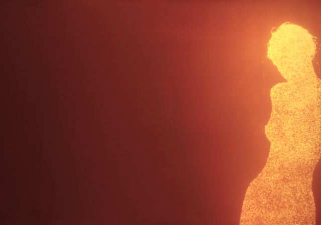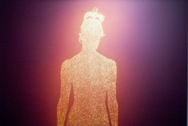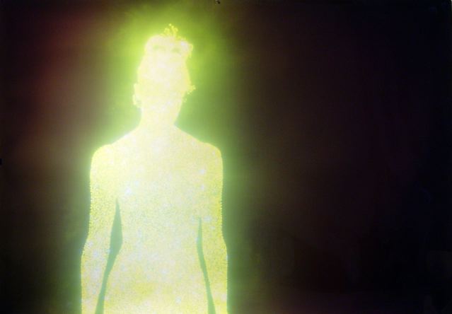 “Bucklow begins by projecting the shadow of his sitter on a large sheet of aluminum foil and tracing its outline. He then makes about twenty thousand small pinholes in the foil silhouette (one for each day of the average human lifespan). Using a contraption of his own device that places the foil over a large sheet of photographic paper, Bucklow wheels his homemade ‘camera’ out into daylight and pulls the ‘shutter’ to briefly expose the paper to direct sunlight. Thus each finished picture becomes a kind of photogram silhouette composed of thousands of pinhole photographs of the sun. The intensity of light on a given day and the length of exposure create unique color variations on how the resulting piece appears.”