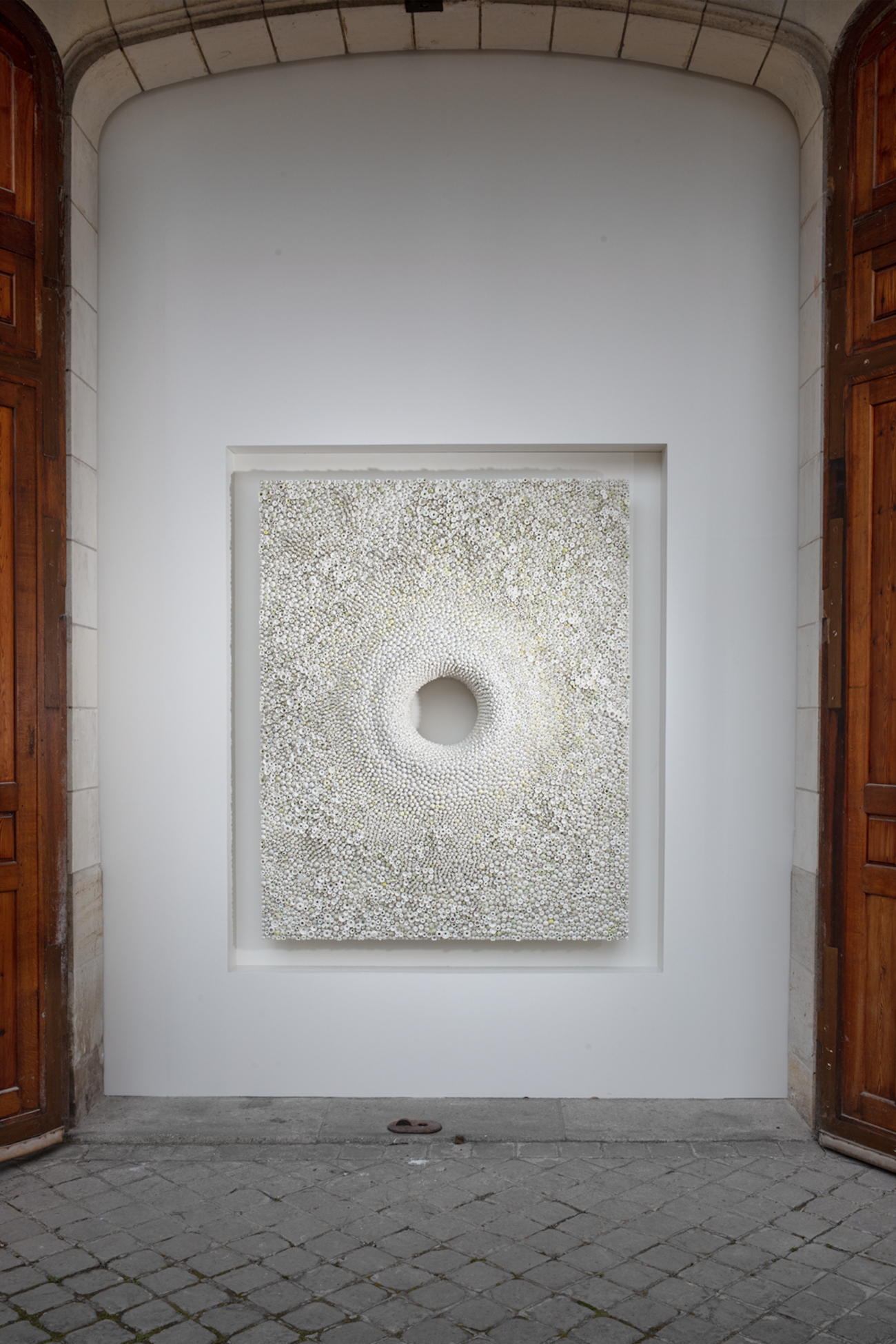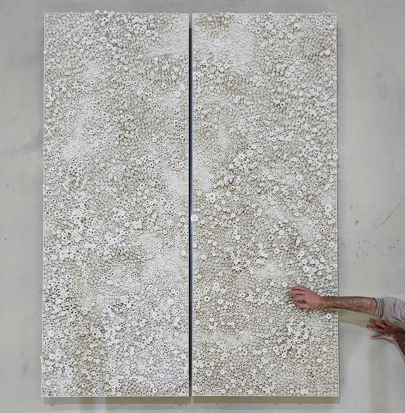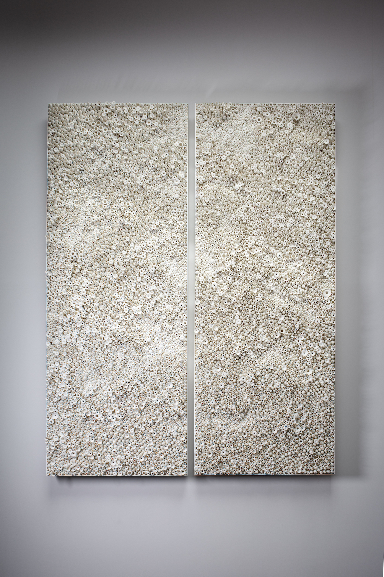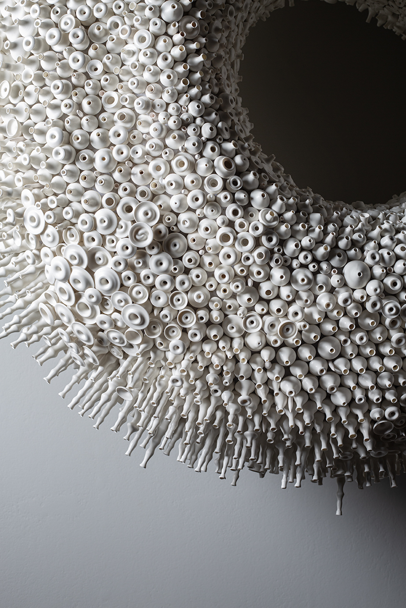It’s hard to ignore the level of texture in Grégoire Scalabre’s sculptures. Even from afar, his voluminous and otherworldly pieces shoot out toward us, their soft spikes, valleys, and curves as captivating as mountain ranges. Look closer, and these forms begin to resemble impossibly tiny vases, wrapped so meticulously around the artwork’s surface that they almost seem to be vibrating.