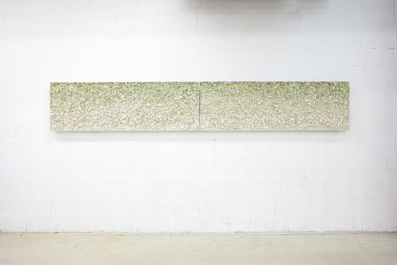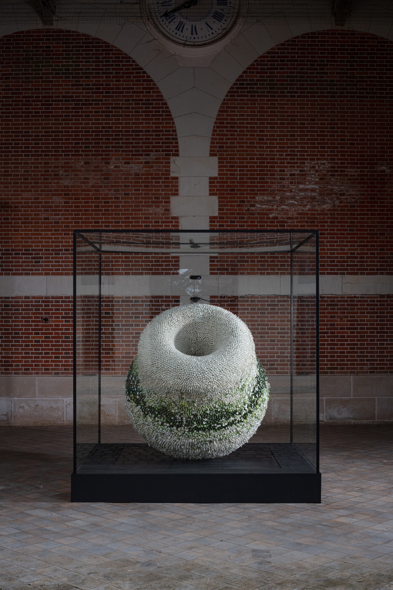 Originally sculpted in 2022, The Final Metamorphoses of Thetis is Scalabre’s homage to the Greek sea nymph Thetis. The monumental piece incorporates more than 70,000 individual vases, doused in rich greens and sheer whites. The color gradation from white to green and back again emphasizes the varying depths and minerality of the sea, while the sculpture’s shape swells and retreats like an ocean wave. And, even though it seems remarkably precise, The Final Metamorphoses was, in fact, much more intuitive to create.