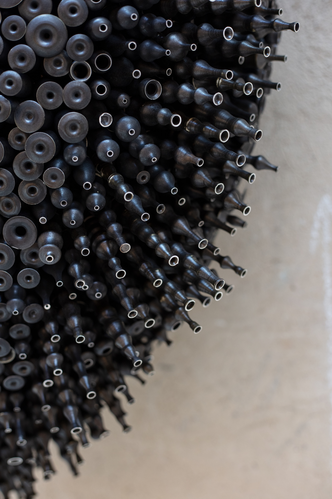 Cygnus, whose name is pulled from the constellation and the Latin word for “swan,” is equally compelling, but is doused entirely in black. With its circular shape and hollow center, the sculpture is reminiscent of the night sky or a black hole, where the amphorae almost strike us as tentacles or unfamiliar life forces. Still, because Cygnus is delicate in its composition, the sculpture isn’t threatening, instead encouraging us to think of what may lie beyond.