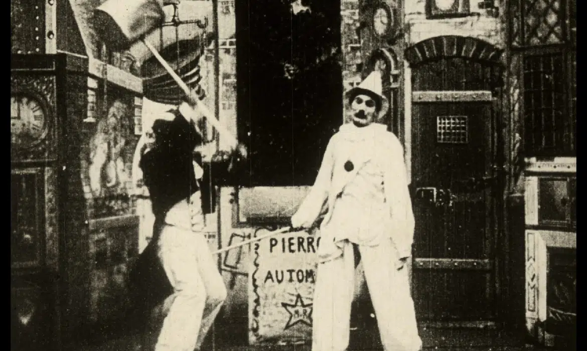 Gugusse the magician winds up his automaton, Pierrot, and Méliès experiments with the jump cut to suddenly age Pierrot up.