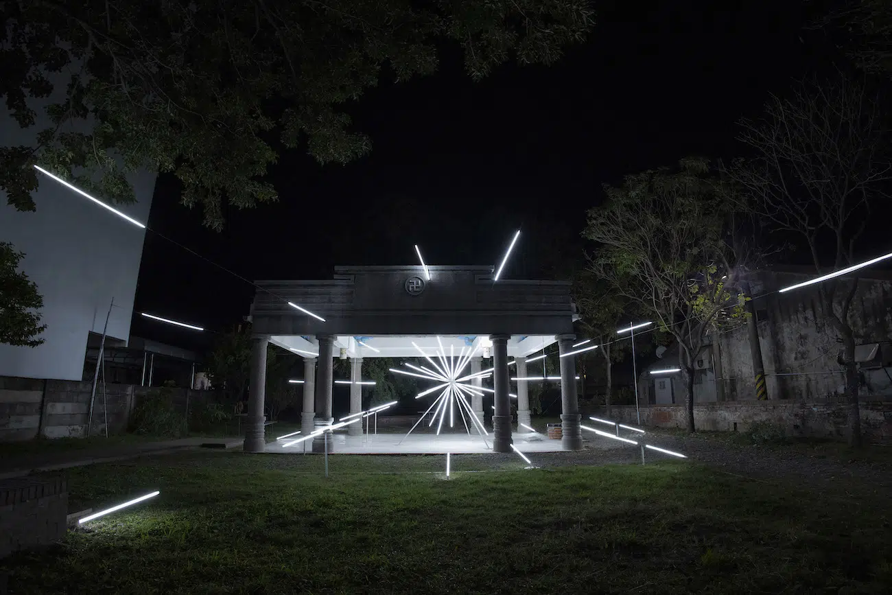 Commissioned by Yue Jin Art Museum, HALO pierces through the Xiu De Bai Pavilion, a 100-year-old former Buddhist temple in the historic Taiwanese town of Yan Shui. The site-specific installation seamlessly interacts with its surroundings, embellishing the temple’s architectural details with its radiance.