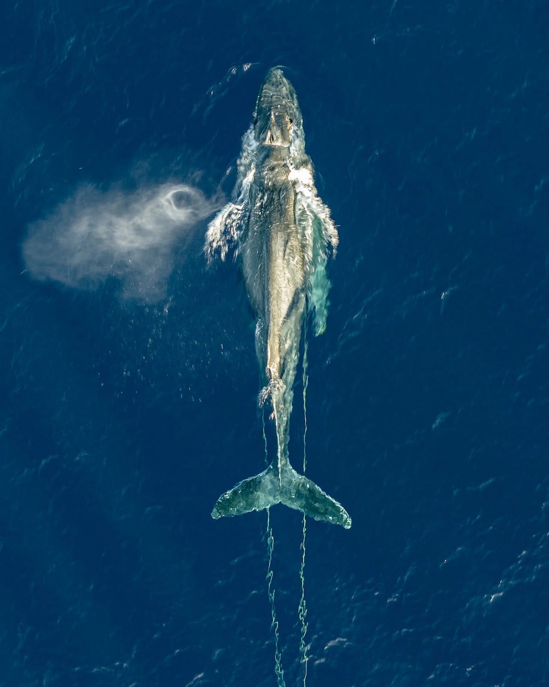 As soon as Kowitz launched his drone, he noticed one of the whales was dragging hundreds of feet of fishing gear and chains that were deeply embedded in the animal’s head. “I was excited to see the group of whales from the aerial perspective, but the moment my drone was above the whales my excitement turned to dismay as I noticed an extensive amount of line dragging behind the whale, embedded in its skin just behind its head,” Kowitz told My Modern Met. “It appeared as if it had been there for quite some time.”