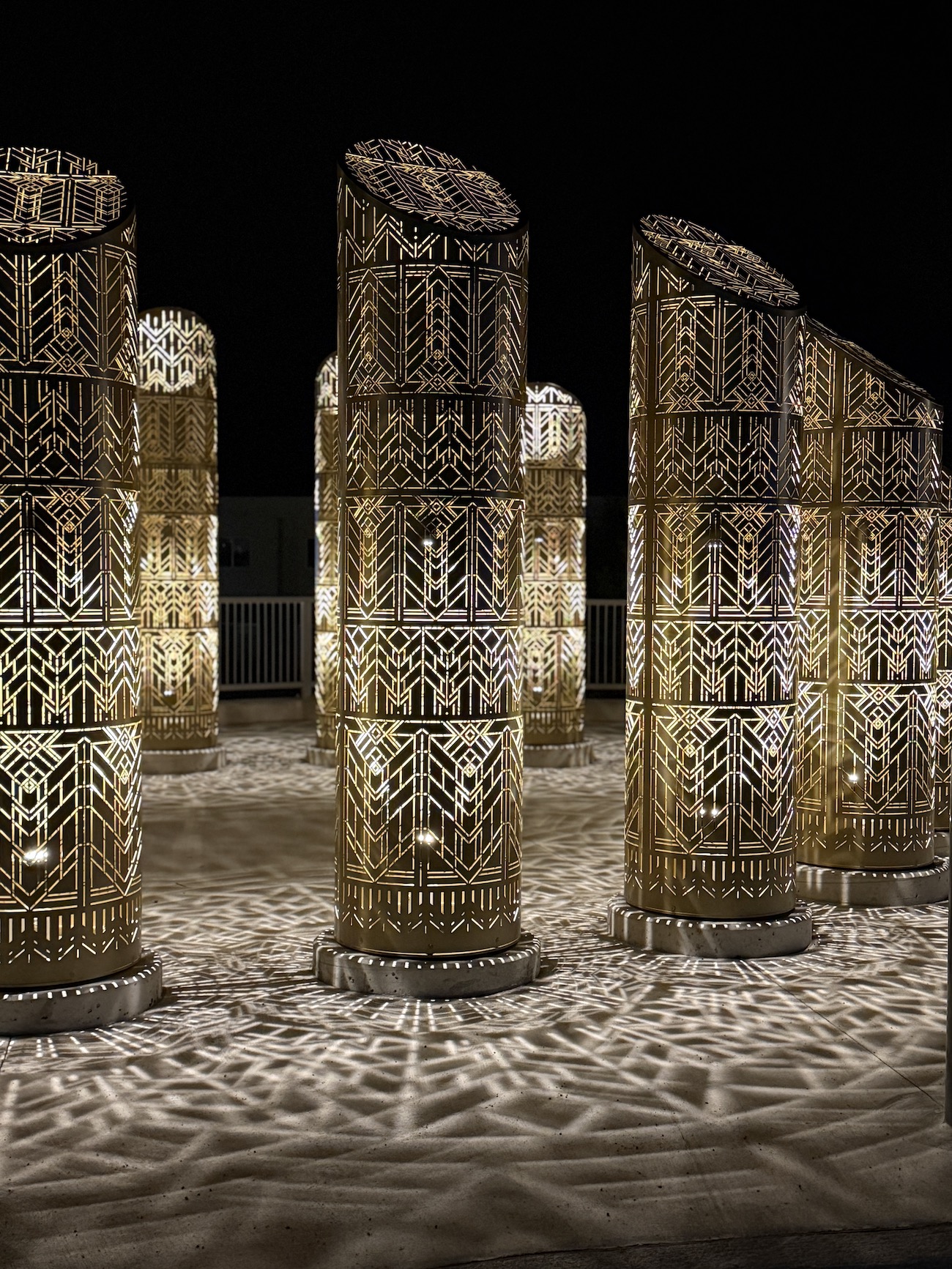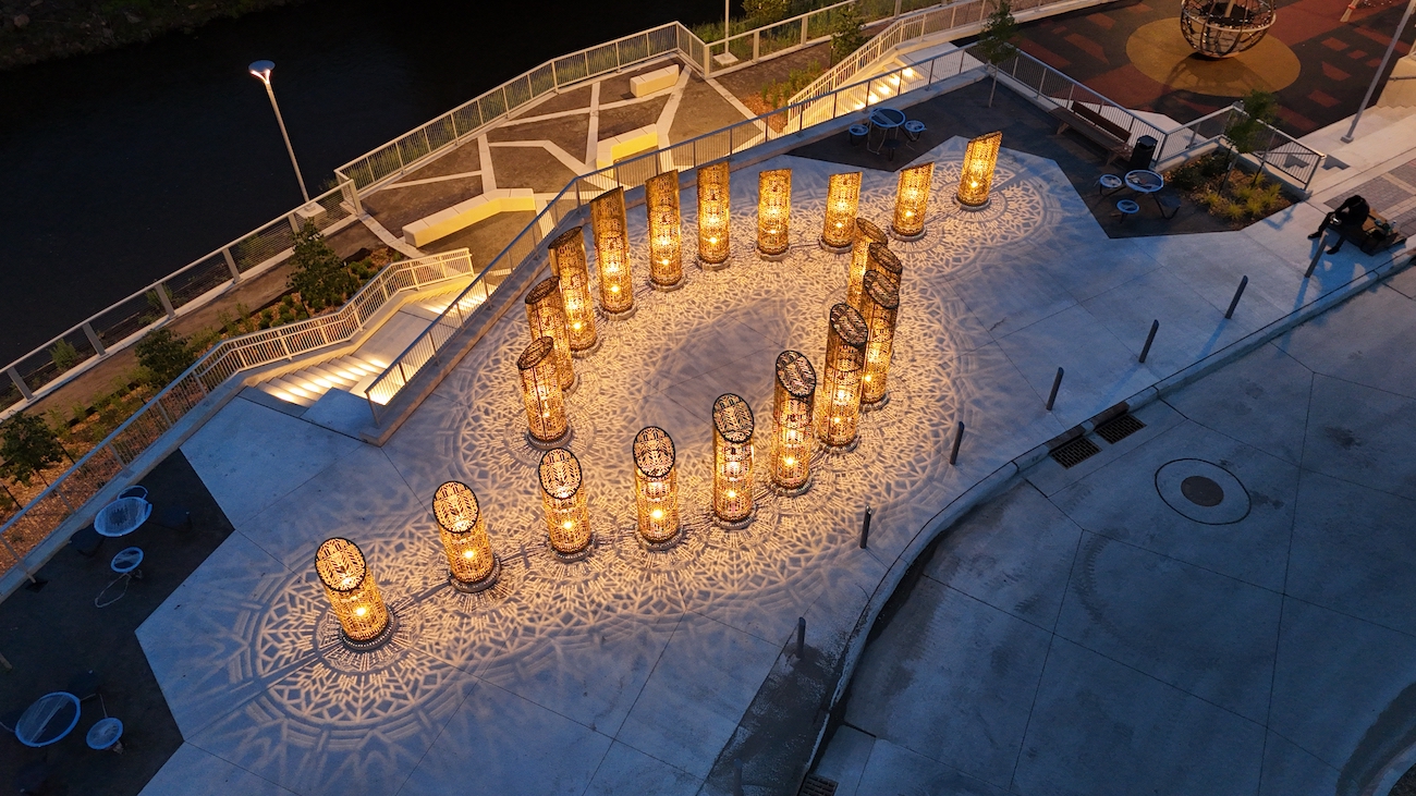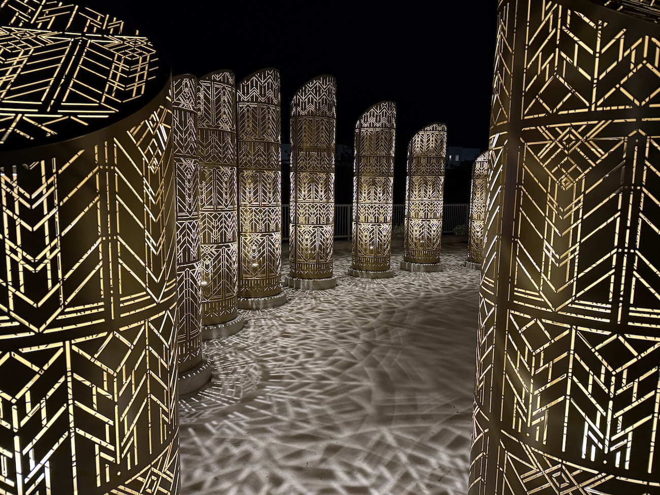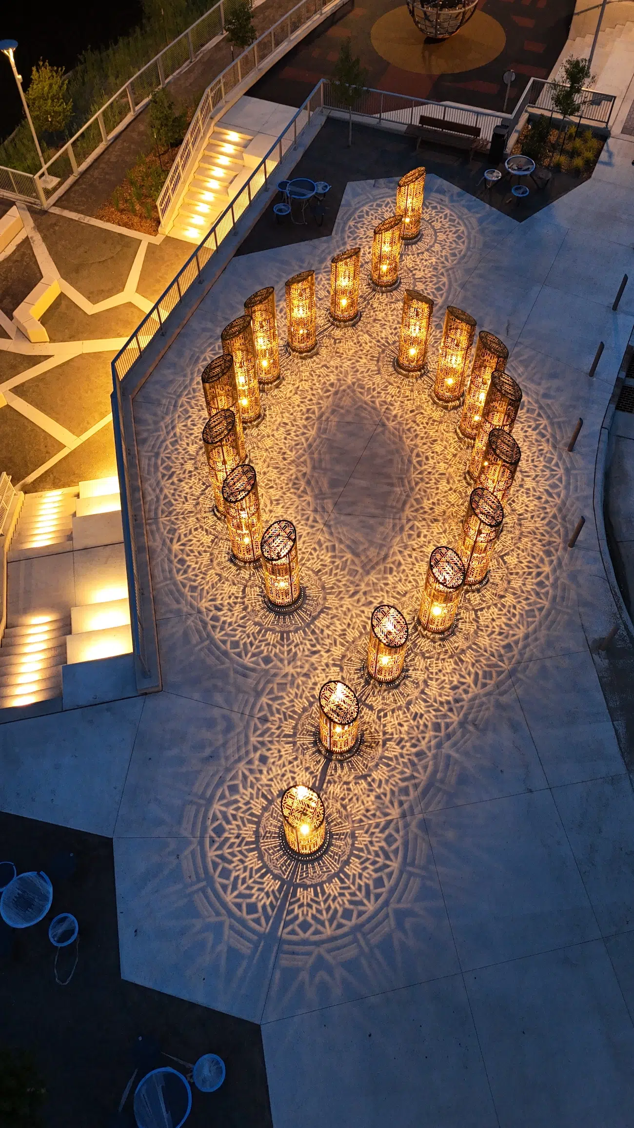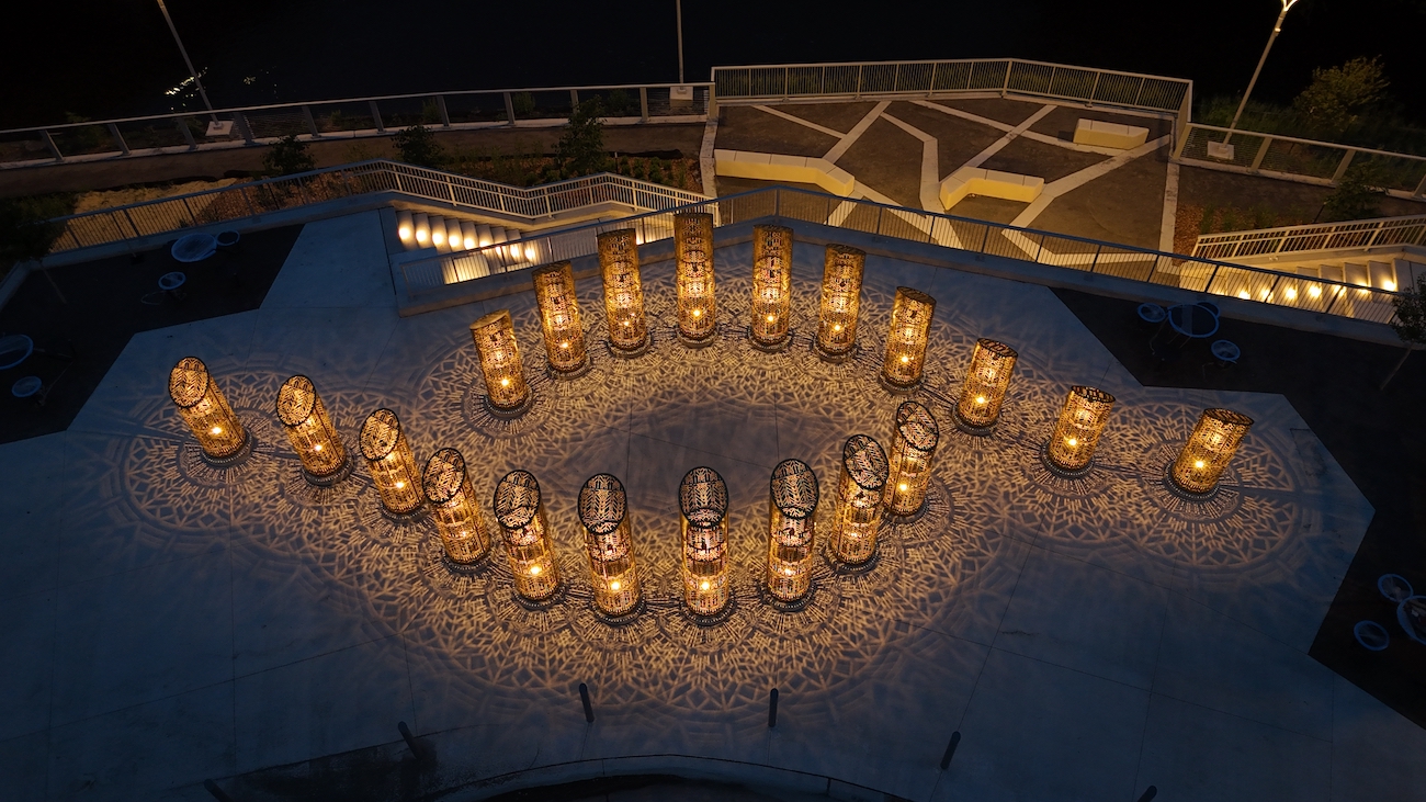 Harmony in Light’s patterns emit a soft light when it’s dark, casting intricate, glowing webs across the ground that encourage visitors to circle around the sculpture.
