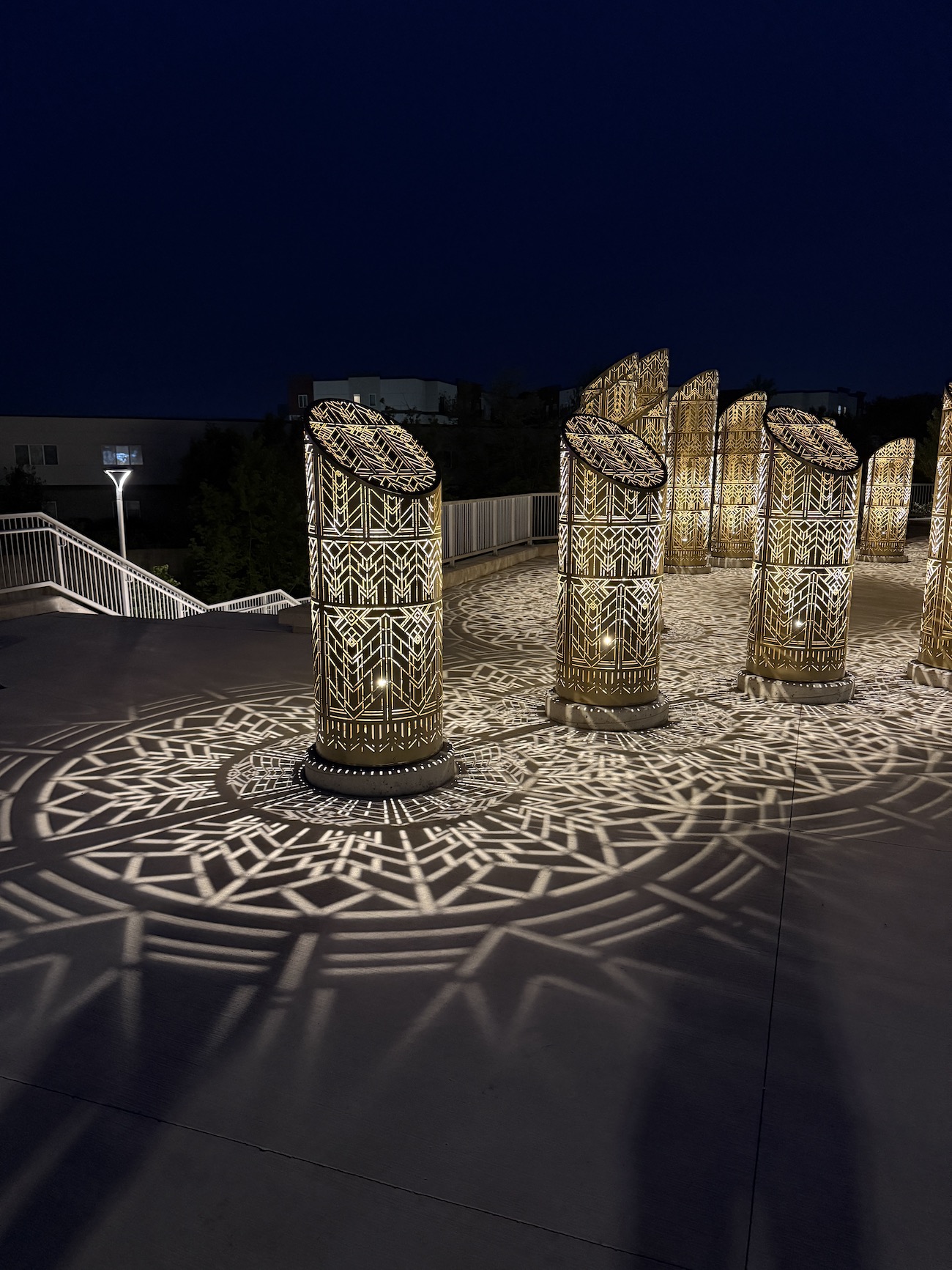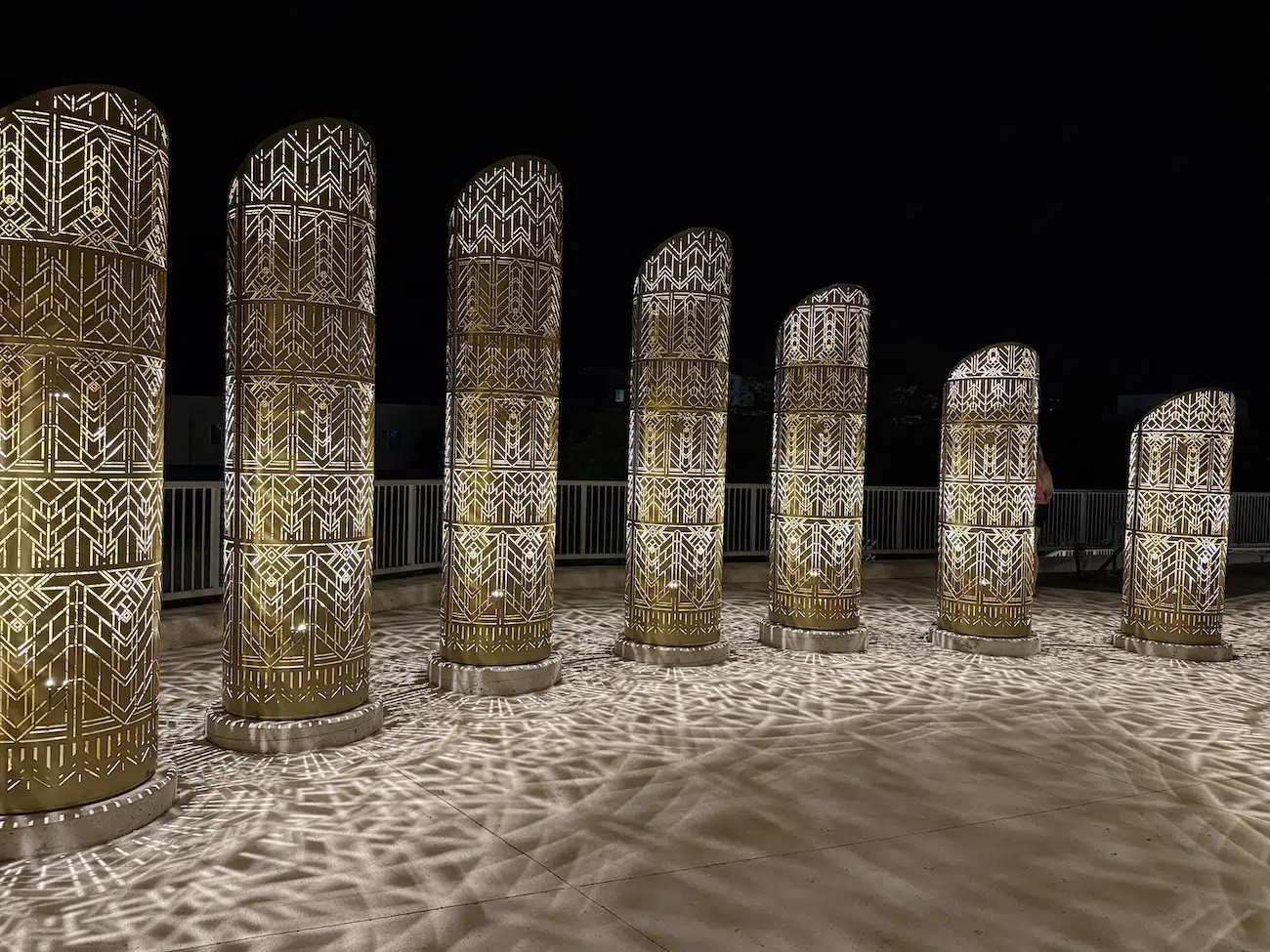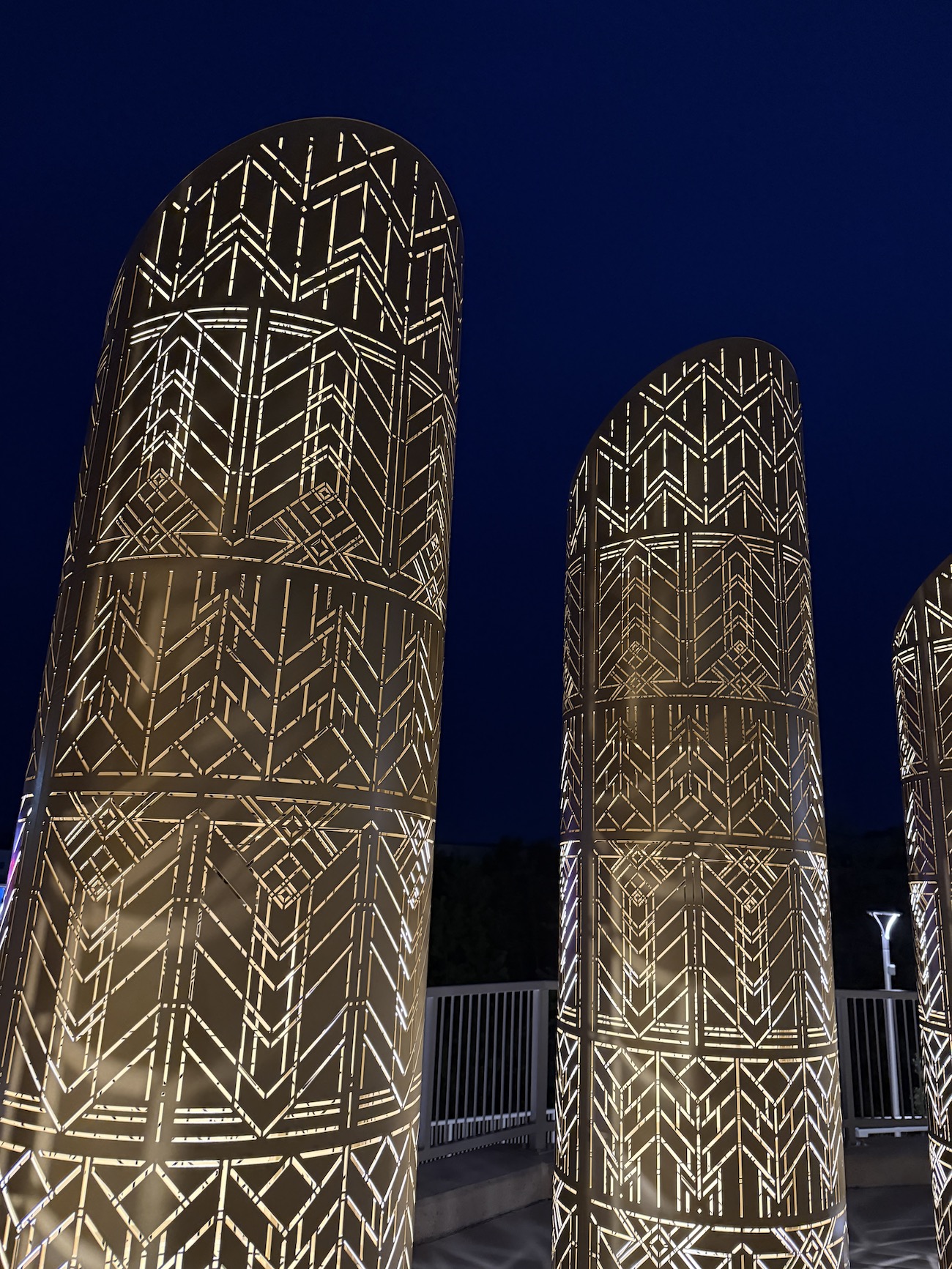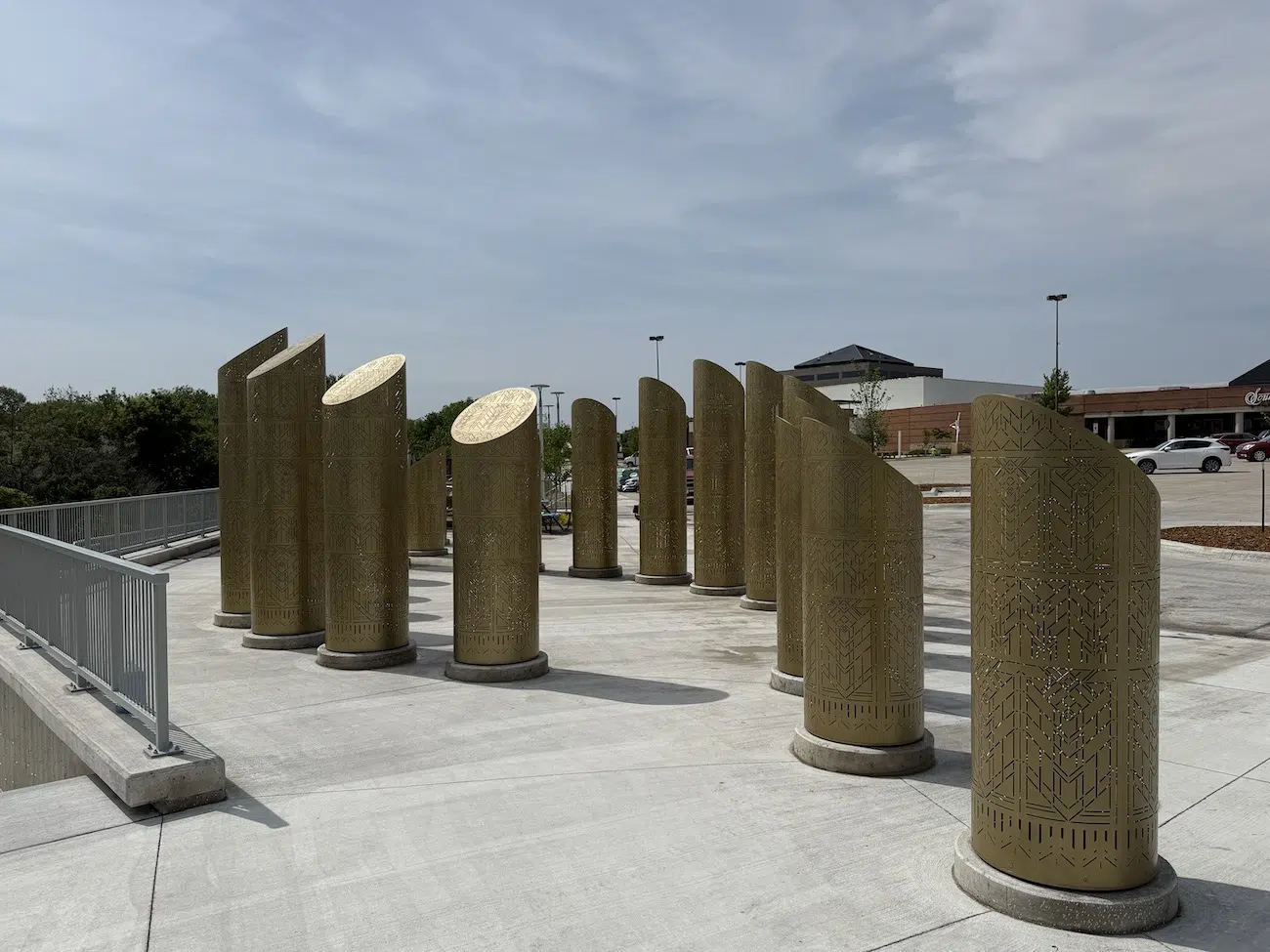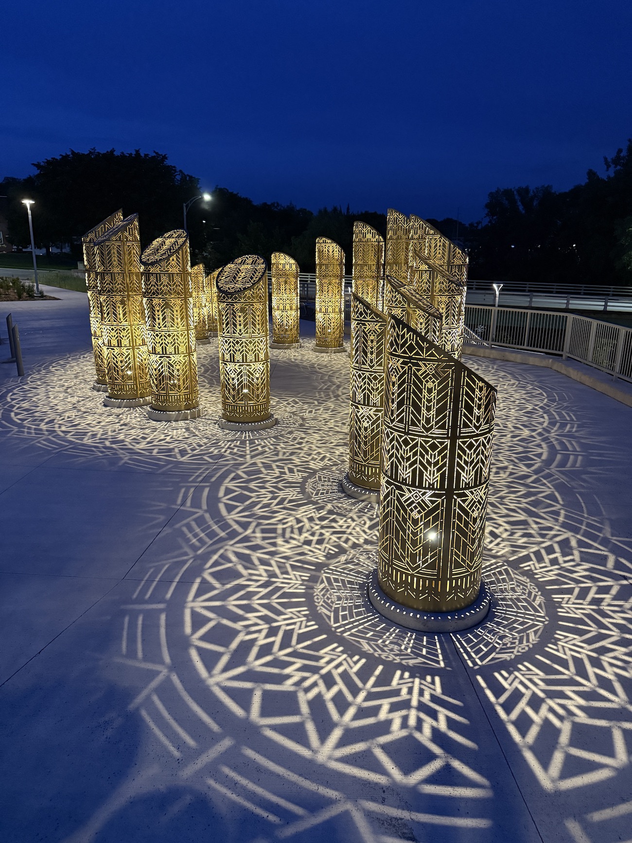Situated at the gateway to the new Riverwalk recreation area, Harmony in Light offers an abstract yet poignant representation of the musical and architectural forms that have historically shaped Mason City. The installation consists of 20 stainless steel cylinders that gracefully rise into the air, their confident, chiseled profiles mimicking the “strong horizontal lines” characteristic of the Prairie School style, per Beaulieu and Filipchuk. Each tower’s golden facade is carved with instrumental sound waves that, at night, cast hypnotic, luminescent patterns across the ground below.