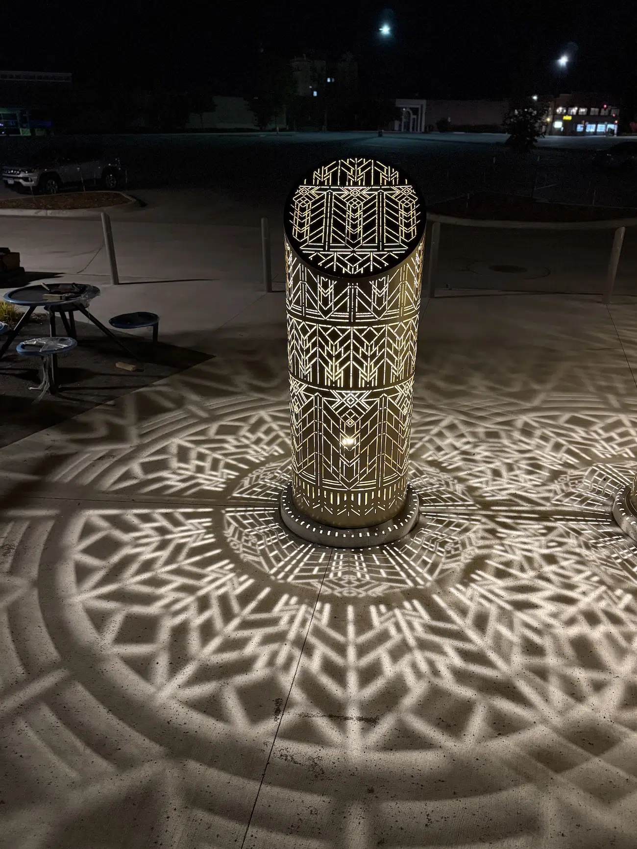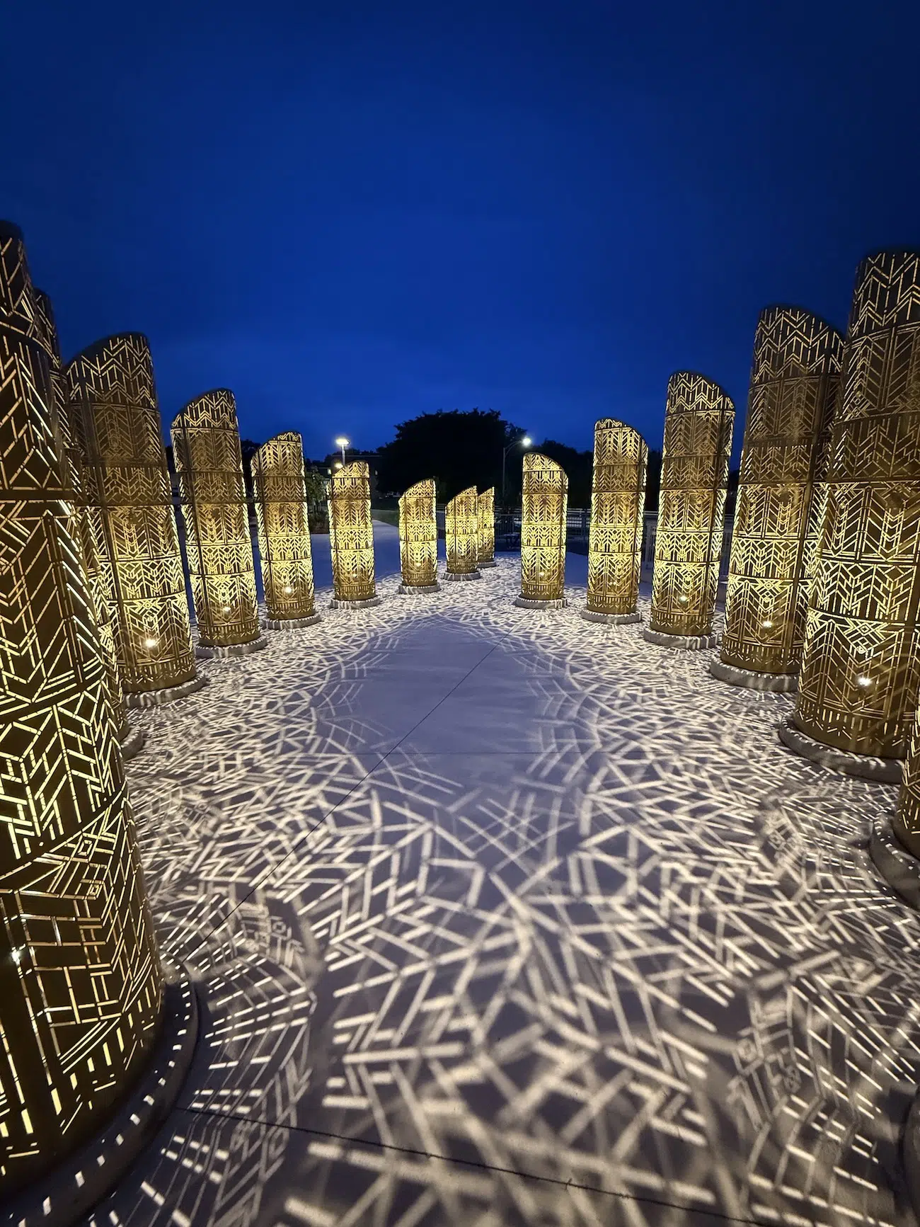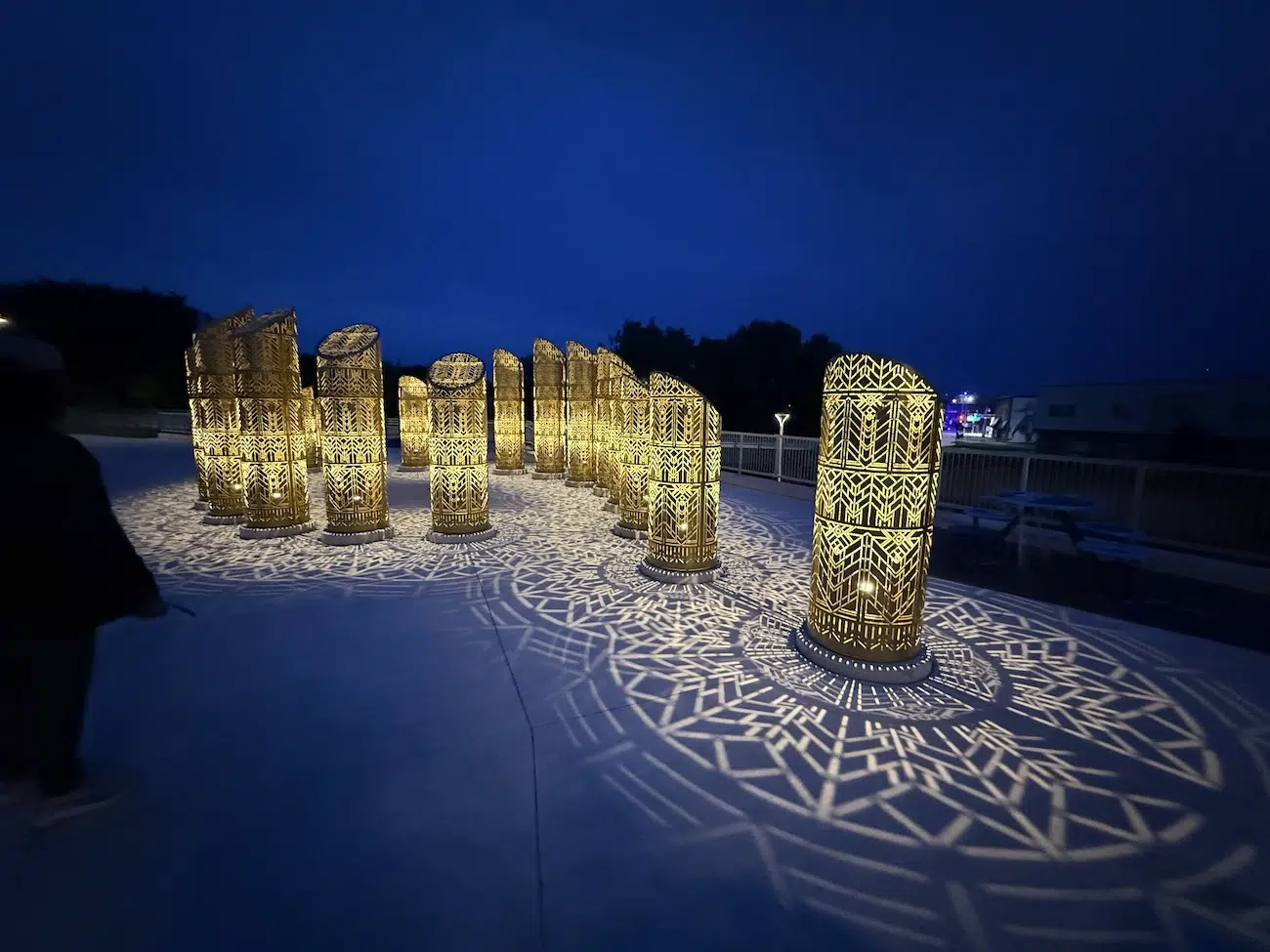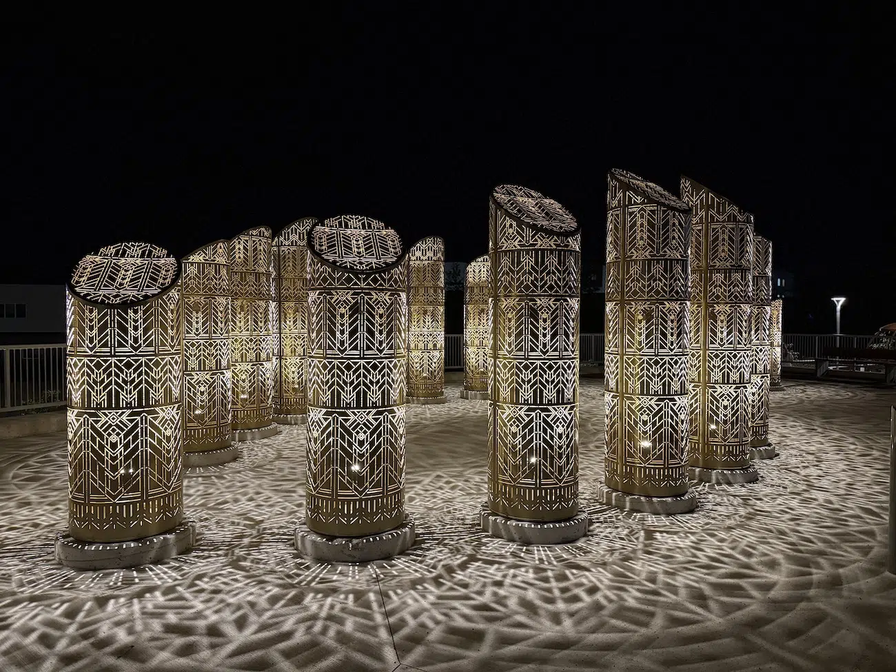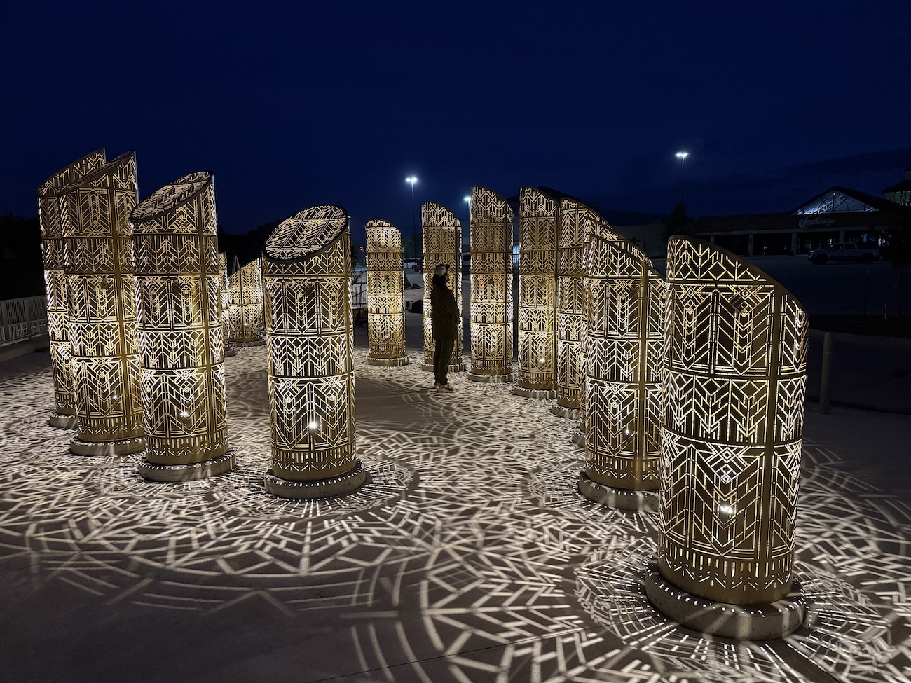Situated at the gateway to the new Riverwalk recreation area, Harmony in Light offers an abstract yet poignant representation of the musical and architectural forms that have historically shaped Mason City. The installation consists of 20 stainless steel cylinders that gracefully rise into the air, their confident, chiseled profiles mimicking the “strong horizontal lines” characteristic of the Prairie School style, per Beaulieu and Filipchuk. Each tower’s golden facade is carved with instrumental sound waves that, at night, cast hypnotic, luminescent patterns across the ground below.