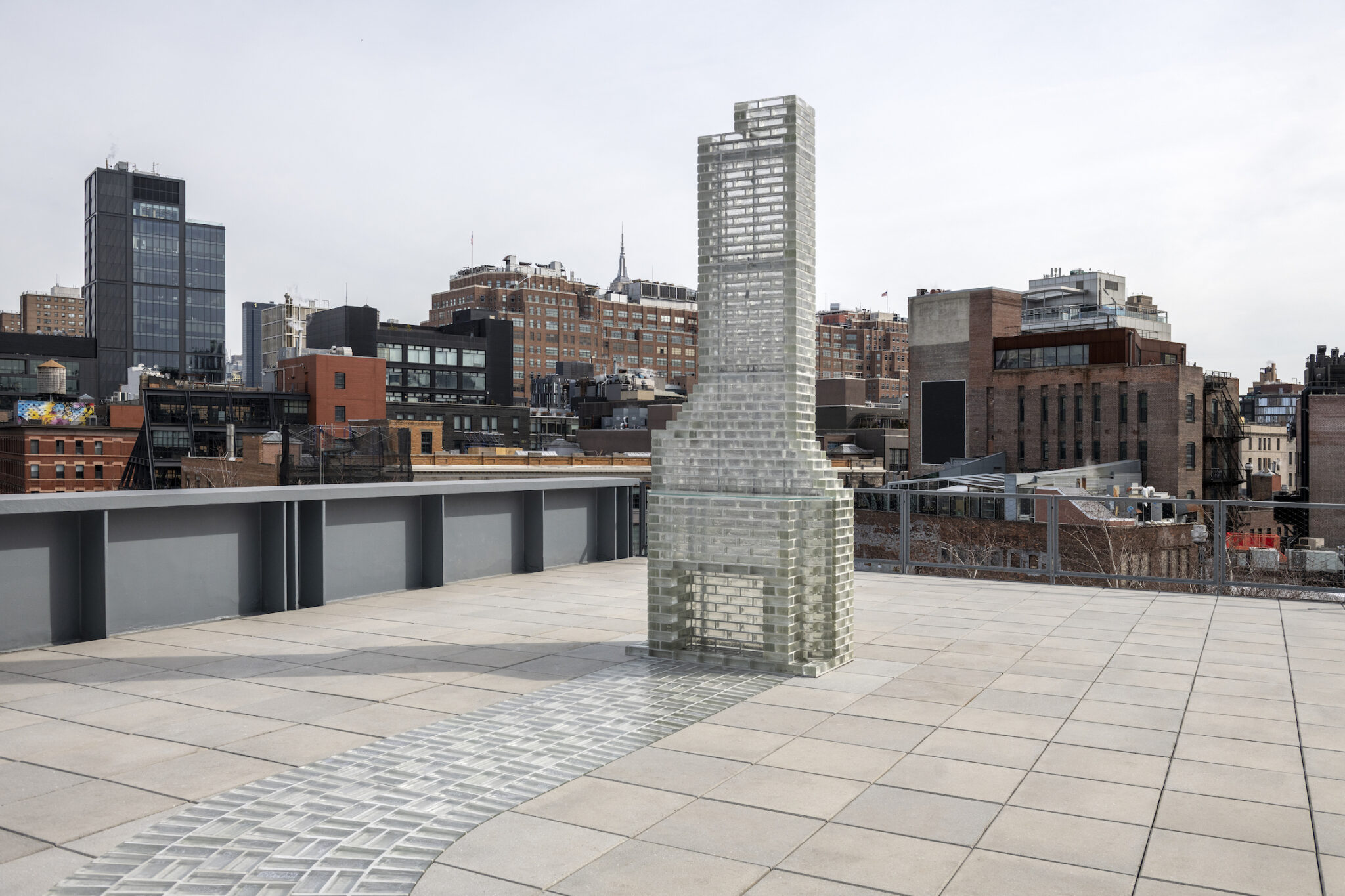 Nestled on the Whitney’s Hyundai Terrace, Monument (Altadena) takes the form of a 13-foot chimney and an accompanying walkway. The installation is the product of a close collaboration with Christian Inga, a mason whose team helped Akashi meticulously reconstruct what little survived of her home. Though certainly similar, this reimagined chimney and pathway diverge from their original counterparts in a key way: they are composed of clear glass bricks. The effect is haunting, as if conjuring a hazy outline rather than a complete presence.