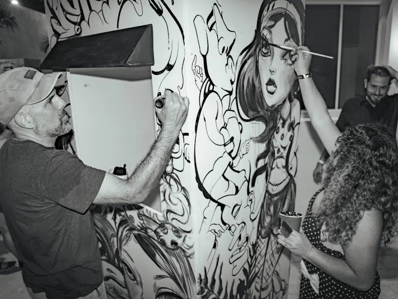 Some of our favorites were the Tigers and Torches Booth, especially the Alien drawing. La Fibra’s living sewing booth and Cynon’s sewn boob pieces—unforgettable. The collaboration of myself, Hox , and Crook’s paintings layered onto Ivan Santiago’s Miami-scape photos. Also, Diana Paz’s mural at El Jardín Inn—it speaks to the future of the neighborhood.