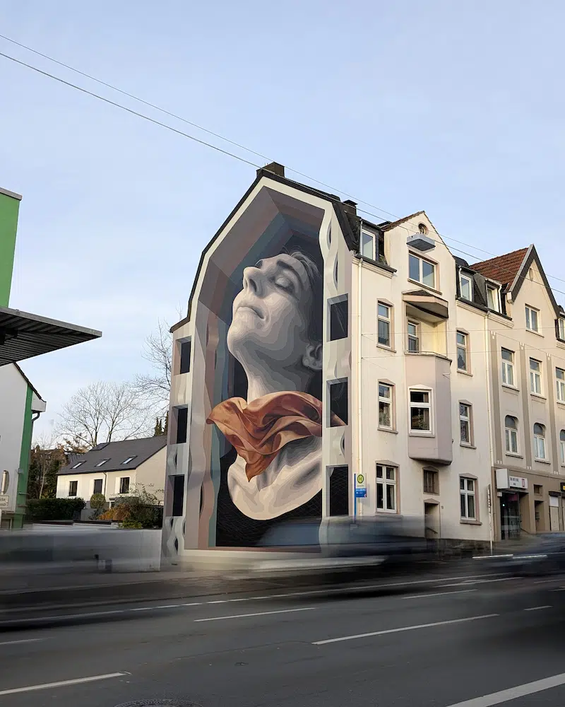 The mural sits on a recessed wall at Kohlenstraße 73 in Wuppertal, Germany. The site functions as a parking area and transitional zone, a setting the artists intentionally embraced. Instead of presenting a fixed image, the work uses anamorphosis, revealing the portrait only from a precise viewpoint. From elsewhere, the figure stretches and fragments across the surface.