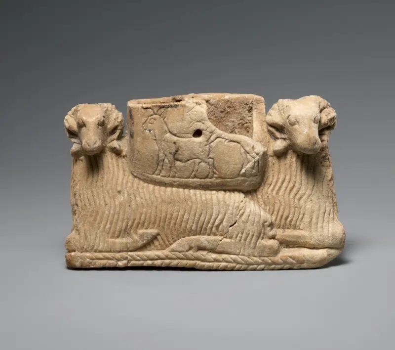 Vessel supported by two rams, Early Dynastic IIIa, ca. 2600–2500 BCE, Mesopotamia, Sumerian, Gypsum alabaster
