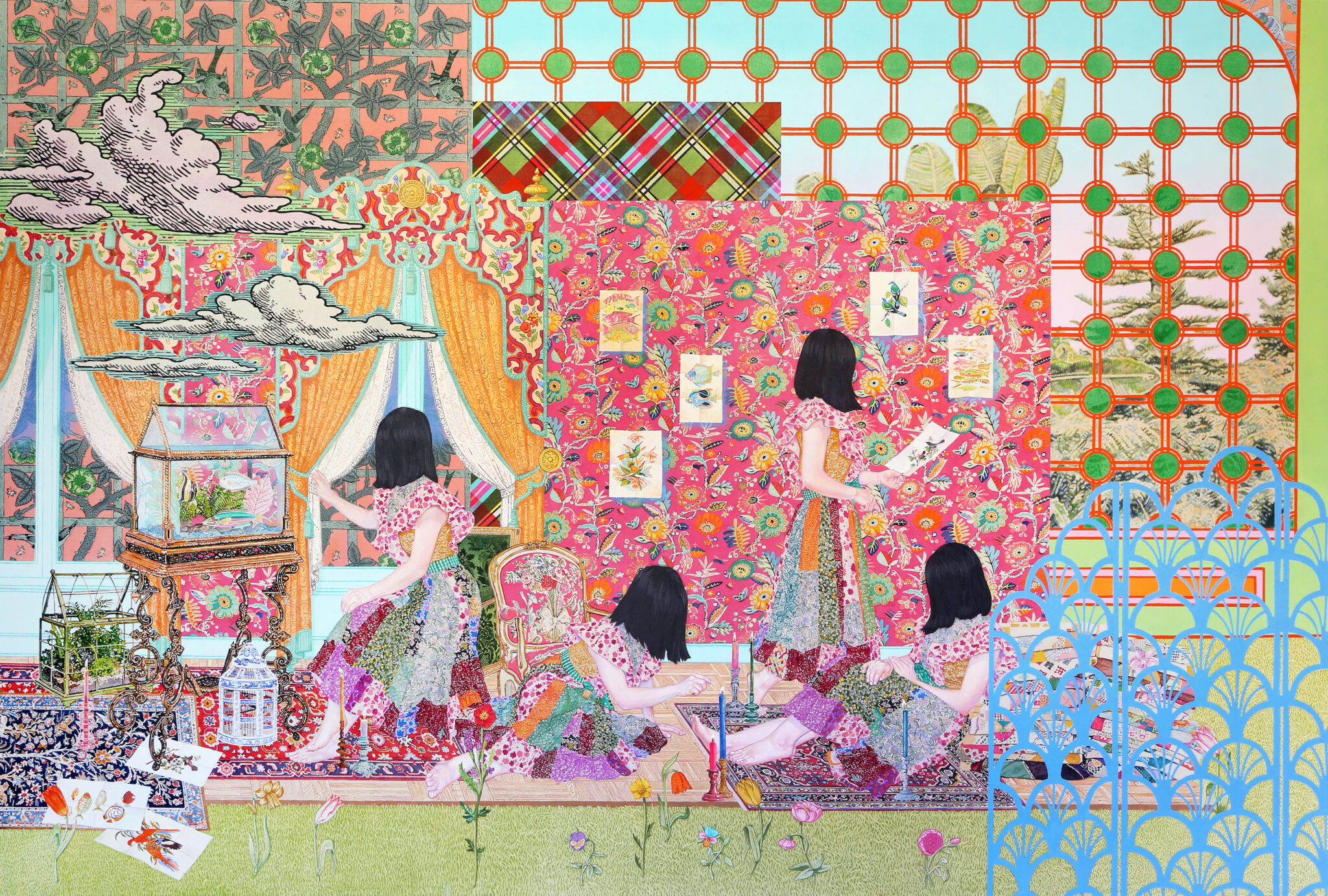 Titled Closely Glazed Space #3, the painting depicts four women dressed in intricate garments, whose patterns practically vibrate with color and texture. Surrounding the figures are several ornamental panels, botanical drawings, and an enormous pane of glass, through which a lush forest can be seen. The entire canvas demands attention with its bold palette, sumptuous details, and idiosyncratic storytelling, prompting questions about who these women are and why they’re enclosed within a greenhouse. Avoiding our view, Okubo’s subjects are meant to be admired, and yet they exist just beyond our grasp, their faces turned away from us and refusing acknowledgement.