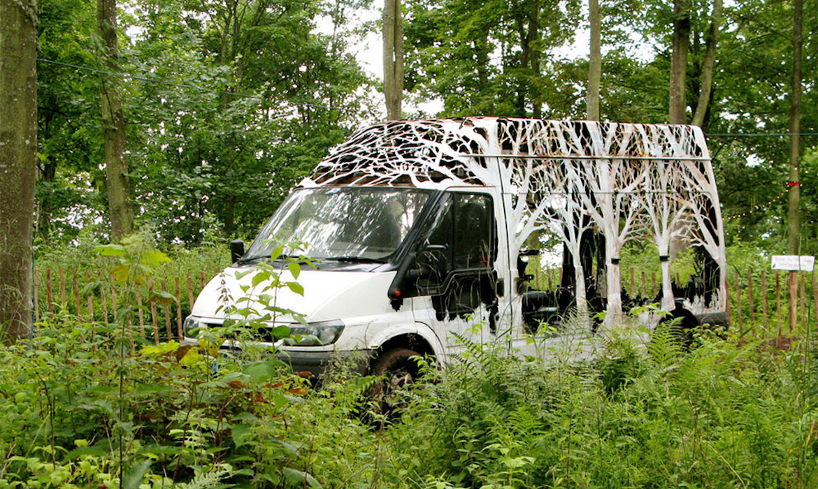 With his work Nature Delivers, artist Dan Rawlings transforms a standard Ford transit van into a forest. The piece was commissioned by Kendal Calling for the Lost Eden festival, giving Rawlings the opportunity to take on this ambitious project. Rawlings' work is typically tinged with nostalgia. He enjoys using old farm equipment and tools to harken back to a simpler time when material possessions held less importance.
