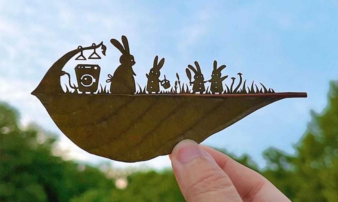 Fallen leaves become the material for intricate carvings in the art of Lito. The self-taught Japanese artist picked up this art form in 2020 as a way to help manage his ADHD. He found that the act of transforming delicate fallen leaves into unexpected designs helped hone his concentration. With patience and steady hands, Lito carves a range of whimsical narratives on a miniature scale.