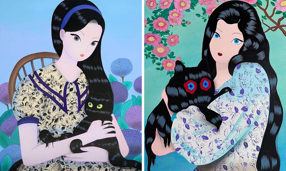 For centuries, cats have served as both inspirations for works of art and as companions for many artists themselves. Korean creative Jang Koal continues this long-standing tradition of feline-inspired art in her own dreamy style. Her series of paintings called Mirage Cat depicts beautiful, raven-haired women holding black cats that are actually made up of their own glossy locks.
