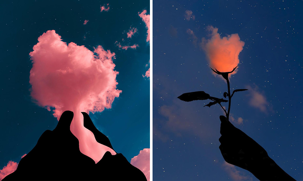 Have you ever looked up and noticed shapes in the clouds? Artist and photographer Lân Nguyen (aka 19.XCV) showcases his playful imagination by transforming photos of the sky. He digitally imposes black silhouettes of various shapes to turn colorful clouds into recognizable objects. From a rose to a strawberry, each wisp of cloud takes on the shape of something new.