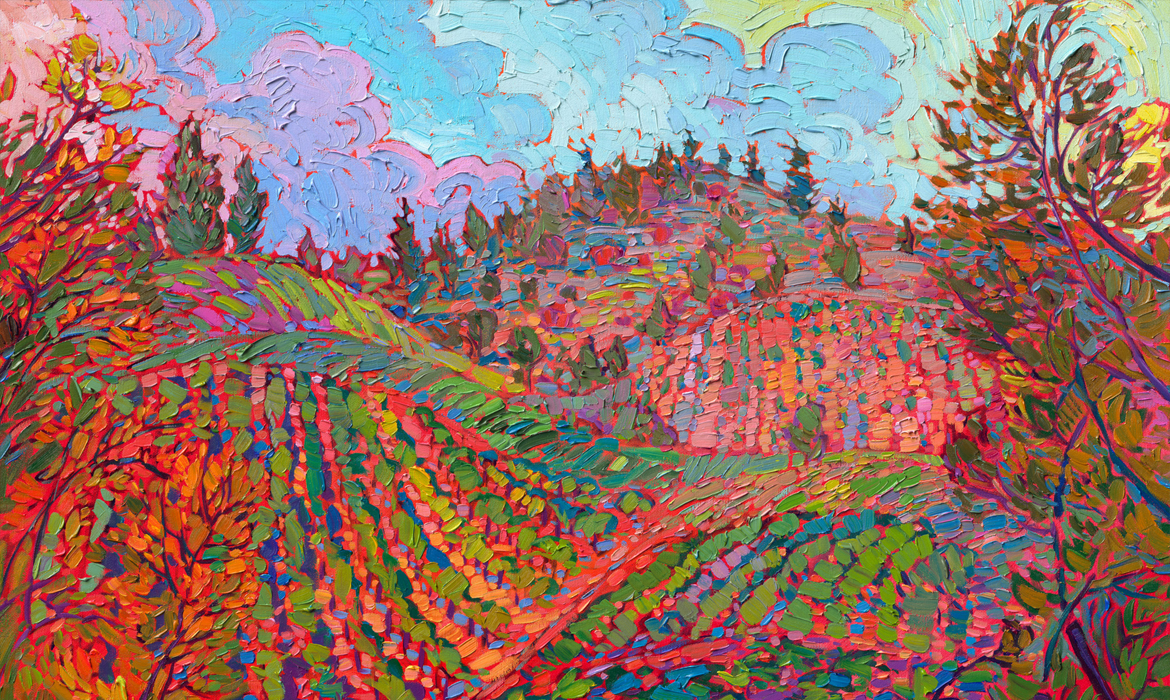 There are few artists who can say they started their own art movement. Erin Hanson—the founder of Open-Impressionism—is one of them. Unlike other types of oil painting, Hanson’s signature style of impressionism does not layer or blend paint. Instead, every element is painted with great intention, resulting in “chunky” brushstrokes of bold colors. These single-layer compositions typically depict the Western American landscapes that first inspired her painting career.
