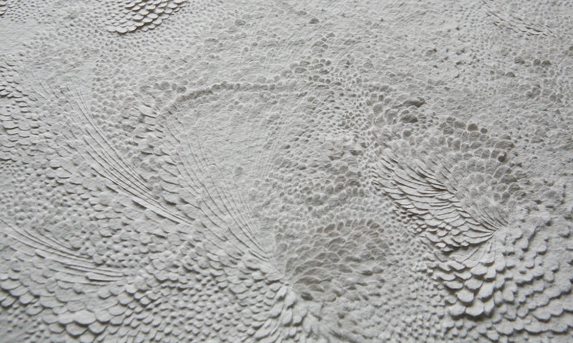 Artist Lauren Collin reveals exquisite textures from flat sheets of paper. Using a scalpel with surgical blades, she carves watercolor paper into “bas-reliefs” that are a dazzling collection of bristling scales in a variety of shapes and sizes. The details of her work are incredible; Collin uses the thickness of the material to create layers of scales that result in a surprising amount of depth.
