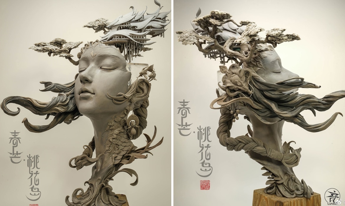 Chinese artist Yuanxing Liang is redefining the traditional bust sculpture with his breathtaking fantasy art. The prototyping teacher crafts intricate portraits featuring faces of women that are fused with delicate flourishes and elements of landscapes. Most notably, their hair becomes a site of surrealism; the long locks wrap around their heads and are the grounds for which miniature buildings, fish ponds, and trees make their home.