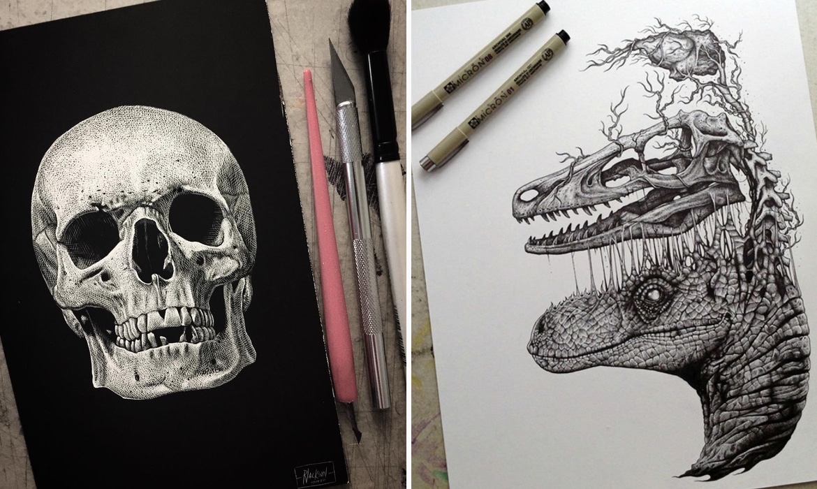 If you like art with an edge, you'll love Paul Jackson‘s illustrations. The British artist, now based in Canada, is a skilled illustrator whose impressive client list includes Primus, Blink 182, The Pixies, the SyFy channel, and Gibson Guitars. Whether using pen and paper or employing a scratchboard technique, his creativity often combines the anatomy of living and dead animals for an eerie effect.