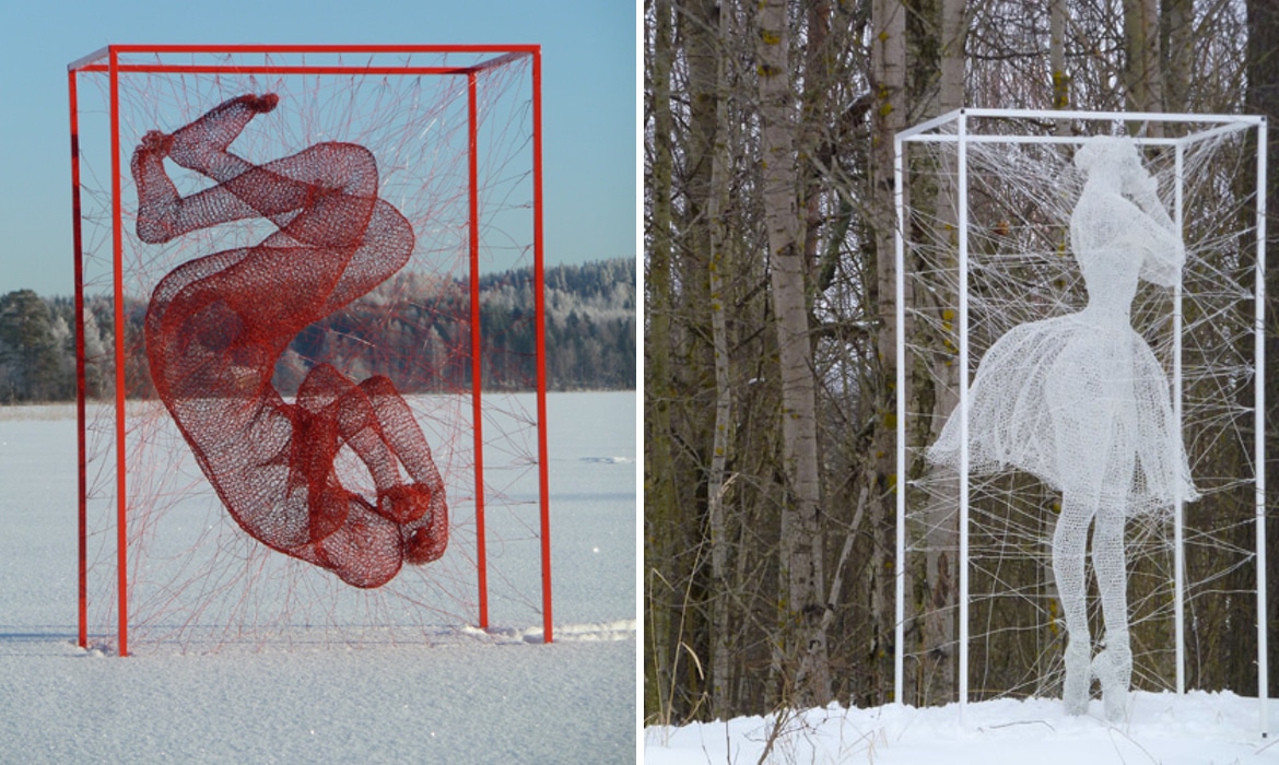 Sculptor Nadia Zubareva creates incredible figurative wire sculptures from stainless steel threads and polymer coating. From Siberia, Zubareva now lives and works between St. Petersburg and Finland, constructing her life-size sculptures with incredible skill. The wire sculpture artist manipulates her medium deftly, molding the metal into expressive figures that at times mimic classical art. Sewn into metal boxes, Zubareva's creations are often inspired by Greek and Roman sculptures.