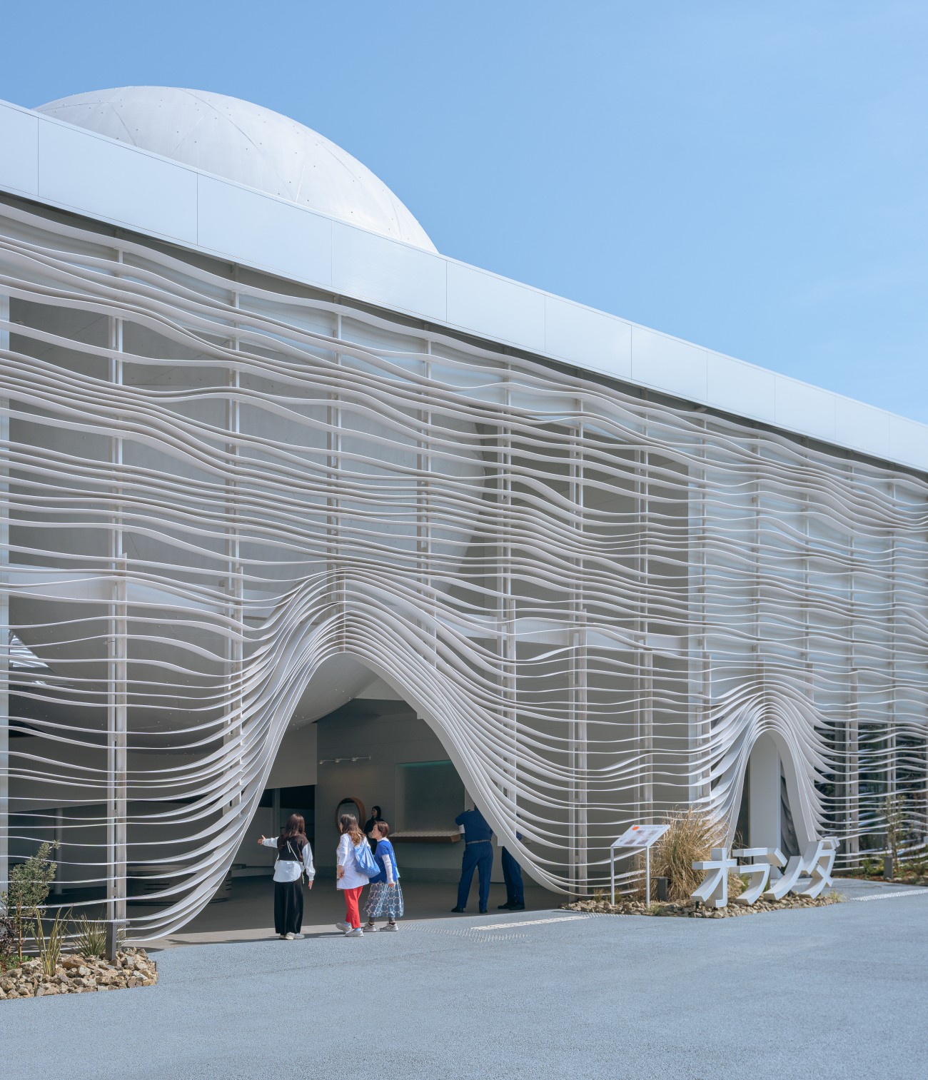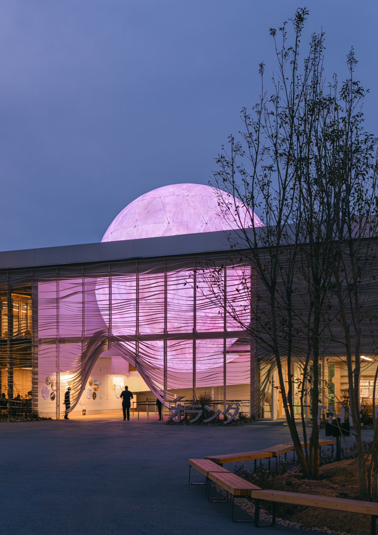 The organic layers that form the building structure act as a visual nest for the sphere. This main structure, which is made of steel and weighs 1620 tons, was created to Japanese standards to withstand earthquakes and typhoons. In support of a circular economy, the temporary pavilion was designed to be easily disassembled and transported to a new site, where it will be given a new purpose.