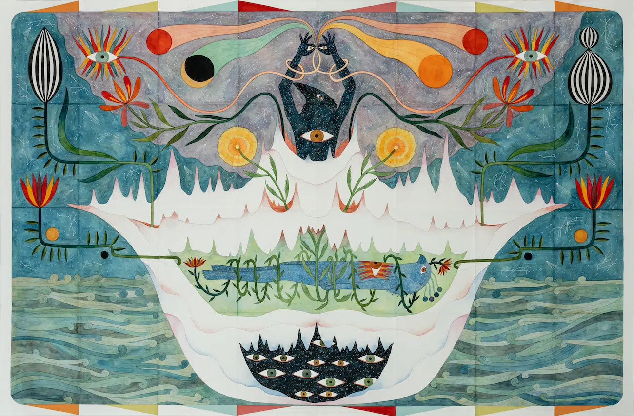 Her intricate watercolors, gouache, and collages visualize a post-human cosmology where life and the cosmos intersect.
