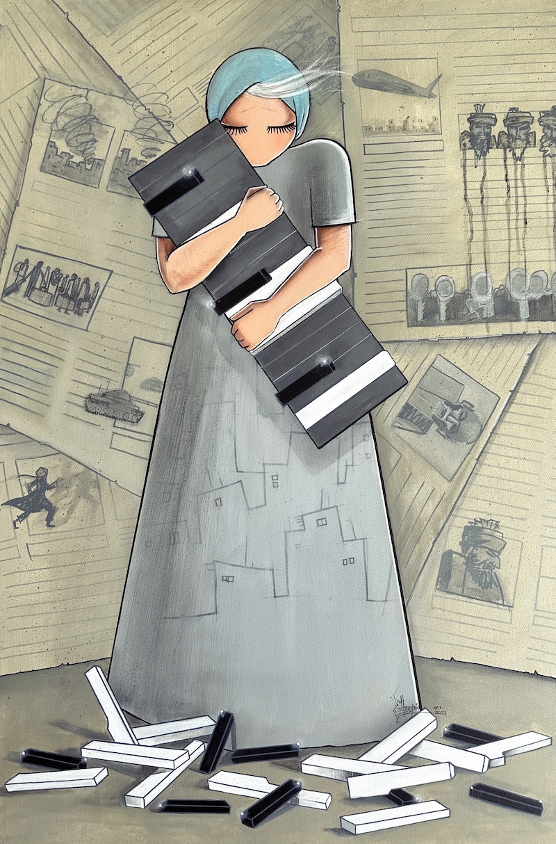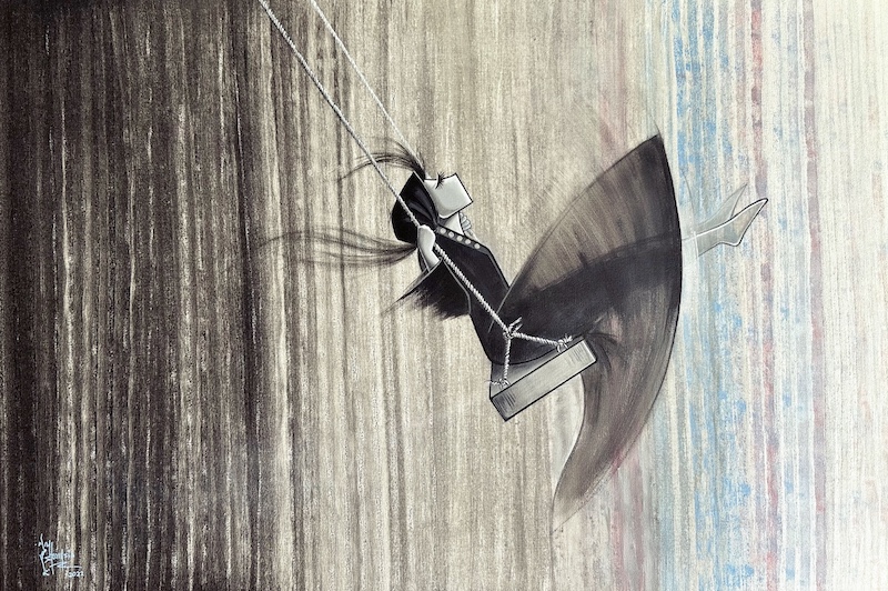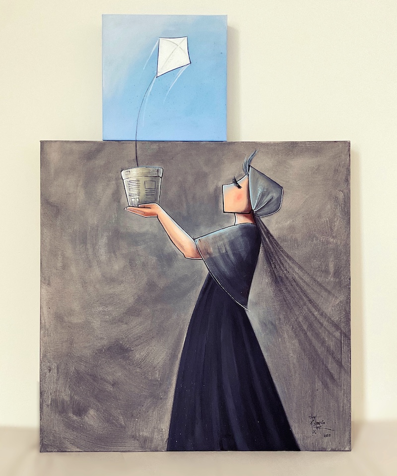 Kites also figure strongly within Hassani’s work, as seen in the artist’s 2023 acrylic painting Freedom. The piece showcases a woman set against a gray background, her hands outstretched and cradling a small pot. The pot isn’t home to a plant or flower, as would be expected, but instead a white kite. As if urging the woman to follow it, the kite shoots out from the pot, soaring away from the gray canvas and into its own smaller canvas doused in a sky blue. The contrast is both deceptively simple yet provocative, joining together disjointed realities—or canvases, in this case—into one cohesive image.