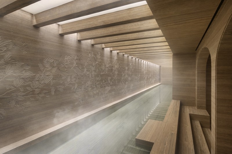 Milan-based designer Patricia Urquiola, who designed the entire hotel, has created a calm, tranquil space for relaxation. With travertine-lined walls and a soft earth-toned palette, a welcoming environment envelopes guests. When taking part in the Roman baths, guests will enjoy a modern adaptation of the ancient ritual with three plunge pools: calidarium (hot), tepidarium (warm), and frigidarium (cold).